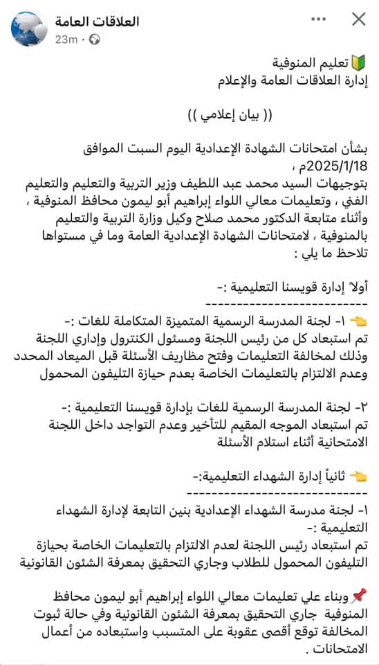 جاء ذلك بناءا على تعليمات اللواء إبراهيم أبو ليمون محافظ المنوفية، ومحمد عبداللطيف وزير التربية والتعليم والتعليم الفني، بضروة العمل على انضباط سير العملية الامتحانية للشهادة الإعدادية بالفصل الدراسي الأول للعام 2024/2025.