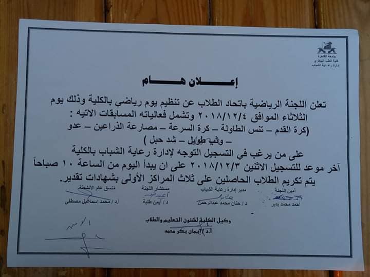 أعلنت اللجنة الرياضية بإدارة رعاية الشباب بكلية الطب البيطري جامعة القاهرة تنظيم يوم رياضي بالكلية، يوم الثلاثاء الموافق 4 ديسمبر المقبل، وتشمل المسابقات: "كرم القدم، تنس الطاولة، كرة السرعة، مصارعة الذراعين، عدو، شد الحبل، وثب طويل".