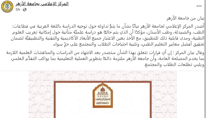 أصدر المركز الإعلامي لجامعة الأزهر بيانًا بشأن ما يتمُّ تداوله حول توجيه الدراسة باللغة العربية في قطاعات: الطب، والصيدلة، وطب الأسنان، مؤكدًا أن الذي يتم حاليًا هو دراسة علميَّة متأنية حول إمكانية تعريب العلوم الطبية، ومدى قابلية ذلك للتطبيق، مع الأخذ بعين الاعتبار جميع الأبعاد الأكاديمية والتقنية والتطبيقيَّة لضمان تحقيق أفضل معايير التعليم الطبي، وتلبية احتياجات الطلاب والمجتمع على حدٍّ سواء.