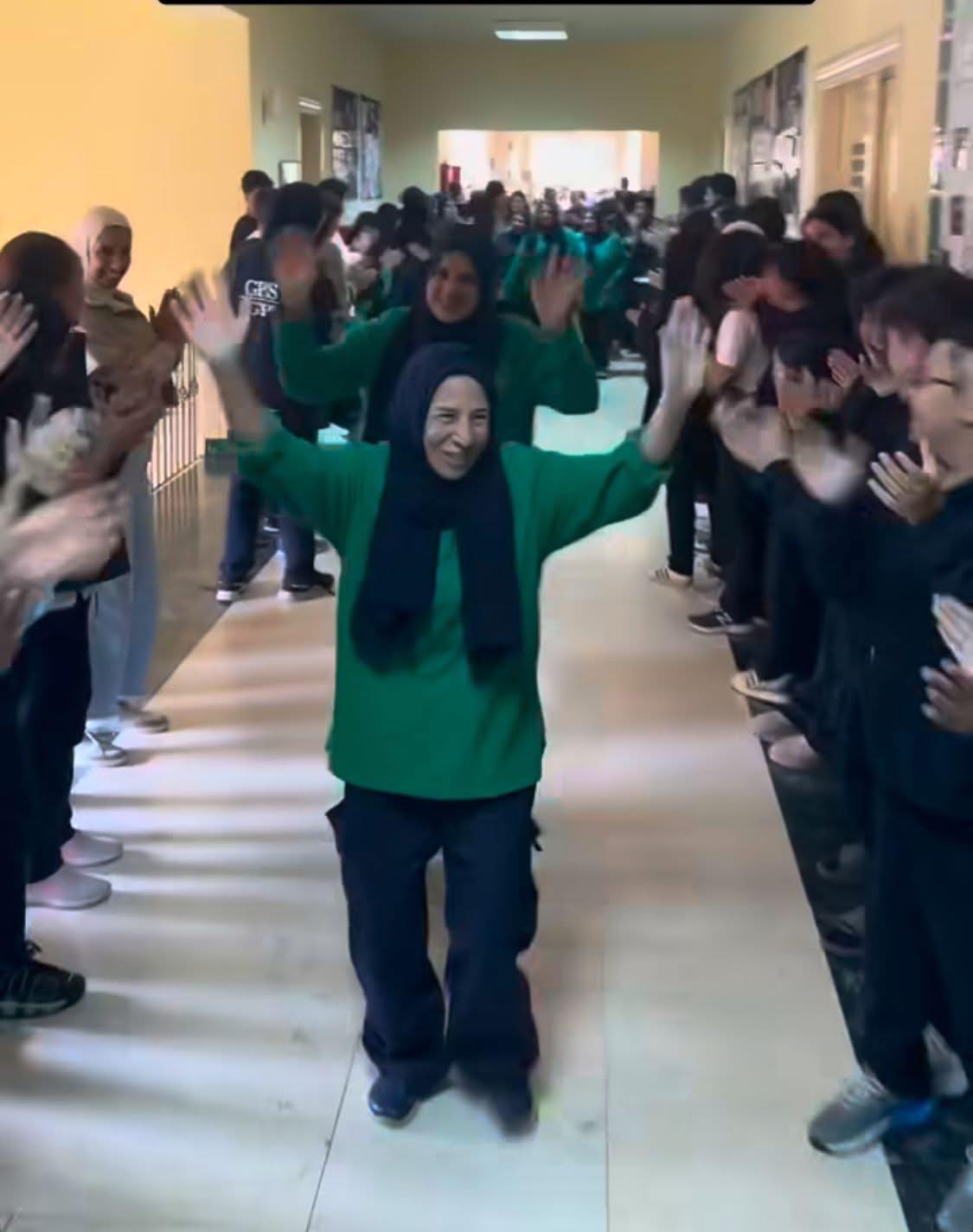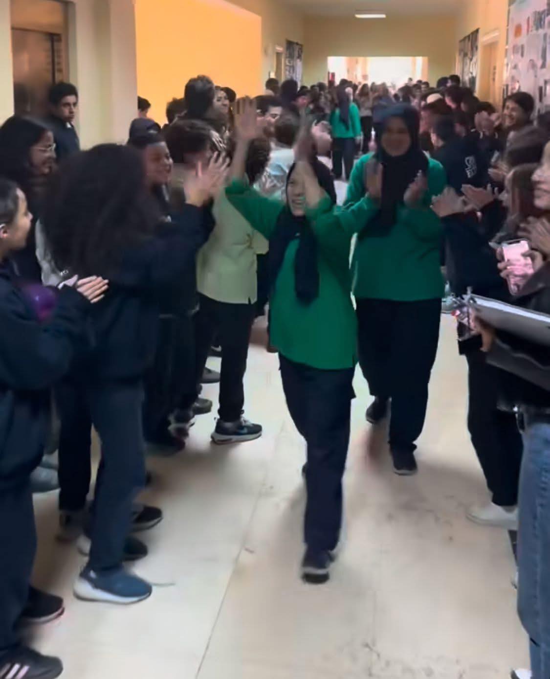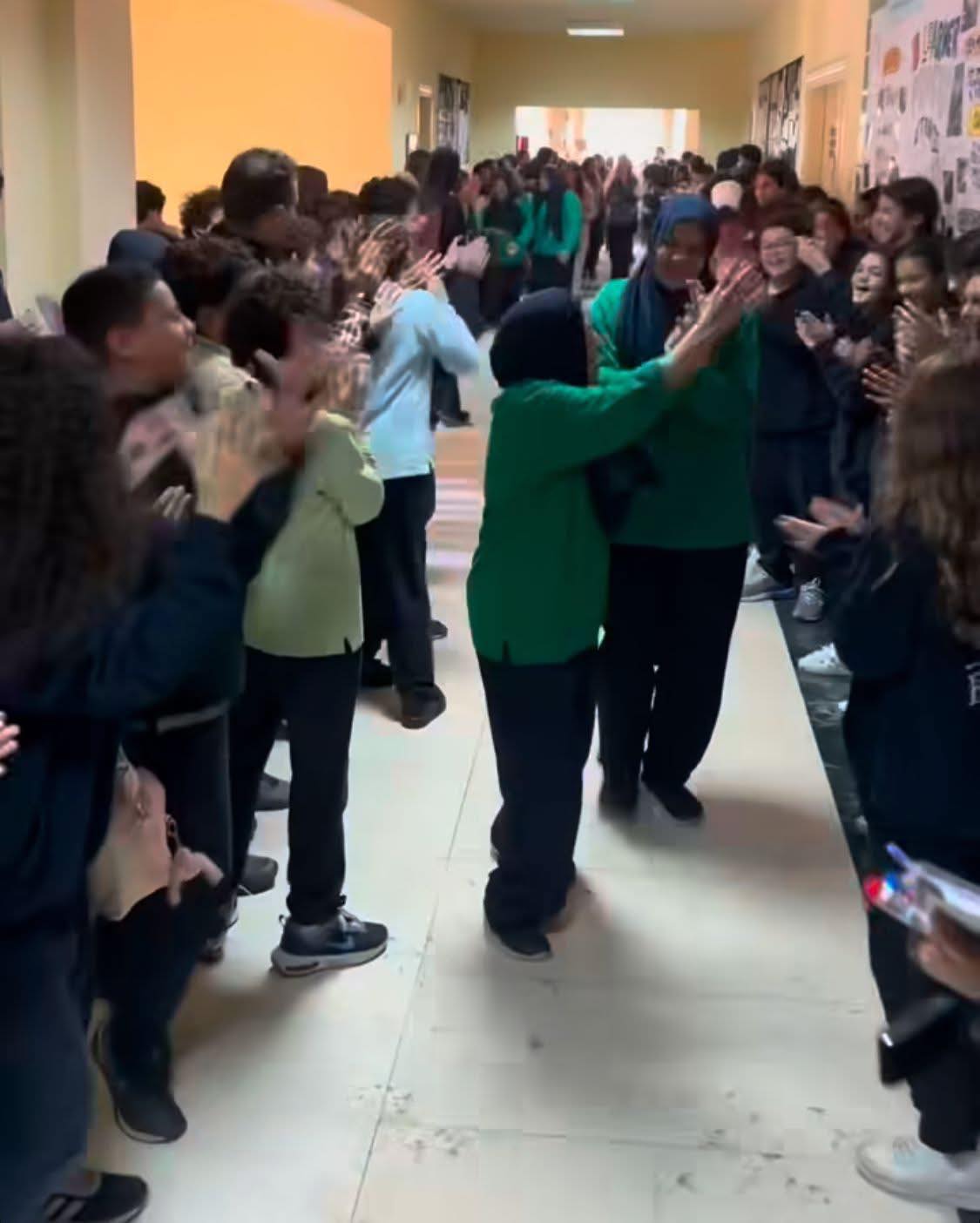 - طلاب مدرسة جرين لاند الدولية نظموا ممر شرفى للعمال واحتفلوا بنجاحهم في امتحان محو الأمية بإشراف من مدرسيين اللغة العربية والطلاب كانوا بيتنازلوا عن مواعيد الراحة بتاعتهم ليذاكروا للعمال لمدة سنة ونصف.
