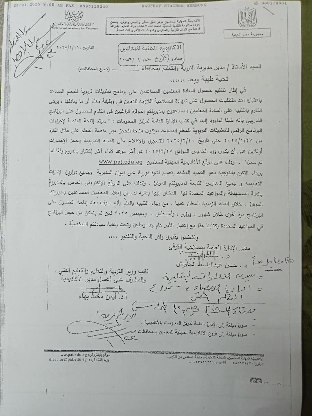 ووجهت بالتنبيه على المعلمين المساعدين الراغبين في التقدم للحصول على البرنامج التدريبي بأنه طبقا لما ورد إلينا في كتاب الإدارة العامة لمركز المعلومات: " سيتم إتاحة المنصة الإجراءات البرنامج الرقمي للتطبيقات التربوية للمعلم المساعد سيكون متاحا للحجل عبر منصة المعلم على خلال الفترة من ۲۰۲٥/١/٢٧ حتى تاريخ ۲۰۲۵/۲/۲۰ للتسجيل والإطلاع على المادة التدريبية وحجز الإختبارات أونلاين على أن يكون يوم الخميس الموافق ۲۰۱٥/٢/٢٧ هو آخر موعد لأداء آخر إختبار بالفروع وفقا لما تم حجزه. وذلك على موقع الأكاديمية المهنية للمعلمين www.pat.edu.eg