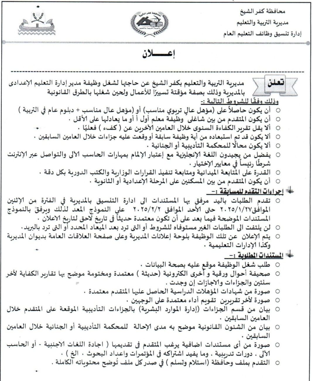 أعلنت مديرية التربية والتعليم بكفر الشيخ عن حاجتها لشغل وظيفة مدير إدارة التعليم الإعدادي بالمديرية وذلك بصفة مؤقتة تسييرا للأعمال ولحين شغلها بالطرق القانونية وذلك وفقا للشروط التالية:-