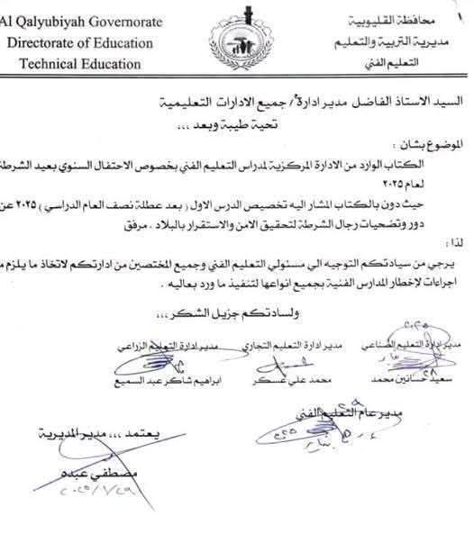 جاء ذلك تنفيذا للكتاب الوارد من الإدارة المركزية لمدارس التعليم الفني:
