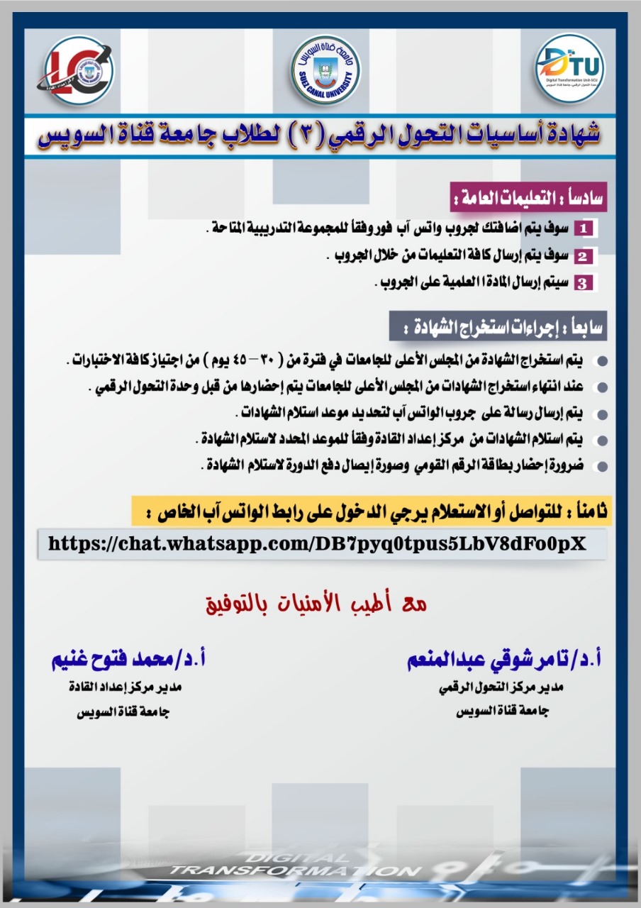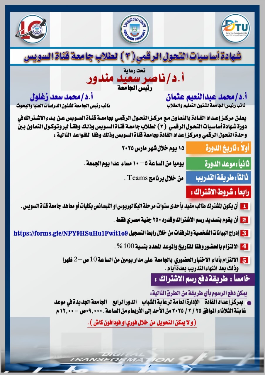جامعة قناة السويس تفتح باب التسجيل لدورة "شهادة أساسيات التحول الرقمي (3)"