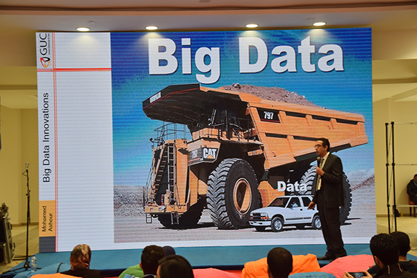 كما ألقى الدكتور محمد عاشور الأستاذ المساعد بكلية هندسة وتكنولوجيا المعلومات محاضرة بعنوان "دور البيانات الضخمة Big data في تطوير الشركات الناشئة" أستعرض خلالها وصفاً تعريفيا للكيفية اللازمة للتفاعل مع ما يسمى بالبيانات الضخمة التي وصفتها الحكومة البريطانية في عام 2012 بأنها تقنية ضمن ثمان تقنيات ذات قيمة مستقبلية خاصة في ظل ما نشهده اليوم من تزايد البيانات بشكل أسرع عن سابقه سواء كان عبر الإنترنت، الحاسب الألي الشخصي ، الهواتف المحمولة ،وملقياً الضوء على الادوات التي تمكن مطوري البرمجيات من تجميع هذا الكم الكبير من المعلومات و تنسيقها تمهيدا لاستخدامها بشكل اكثر فاعلية لإعطاء قيمة مضافة للشركات و المشروعات، موضحاً ان تطبيق التنقيب عن المعلومات Data Mining و وسائل الذكاء الإصطناعي Artificial Intelligence به كم من المعلومات الضخمة المرتبطة باي شركة او مجال عمل يتيح للشركات الناشئة رصد الانماط المرتبطة بتطبيقاتهم مثل انماط الاستخدام و انماط الشراء و انماط الاستجابة للدعاية .