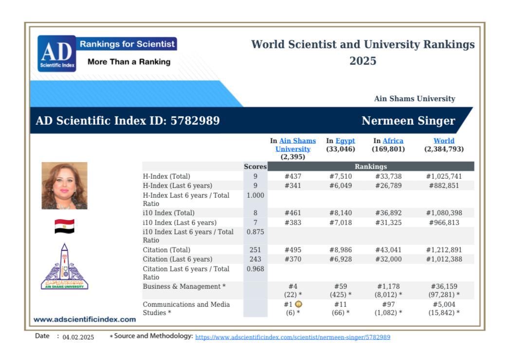 حصلت الدكتورة نيرمين سنجر أستاذ مساعد الإعلام وثقافة الأطفال بجامعة عين شمس على المركز الأول في دراسات الإعلام على مستوى الجامعة، والمركز الحادي عشر على مستوى جمهورية مصر العربية، وفقًا لتصنيف AD العلمي (Alper-Doger Scientific Index) لعام 2025. كما احتلت المركز 97 على مستوى القارة الأفريقية، وجاءت في المرتبة 5000 عالميًا في نفس التصنيف، وذلك في إنجاز علمي جديد يعكس التميز الأكاديمي والبحثي لجامعة عين شمس تحت قيادة الدكتور محمد ضياء زين العابدين، رئيس الجامعة.