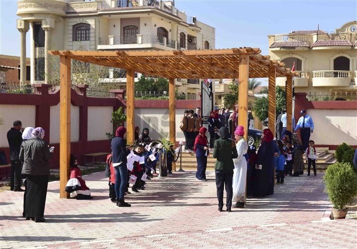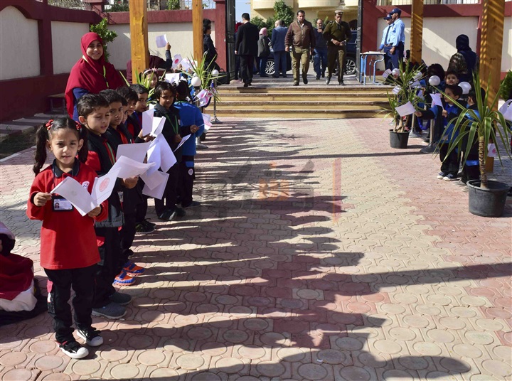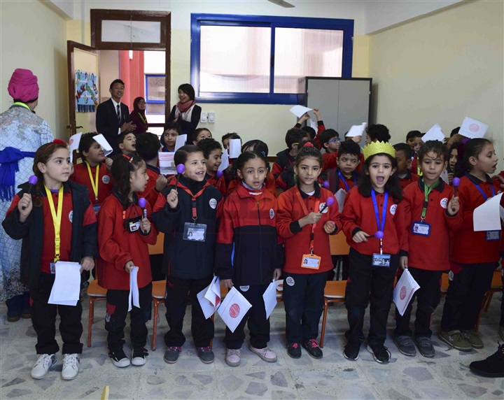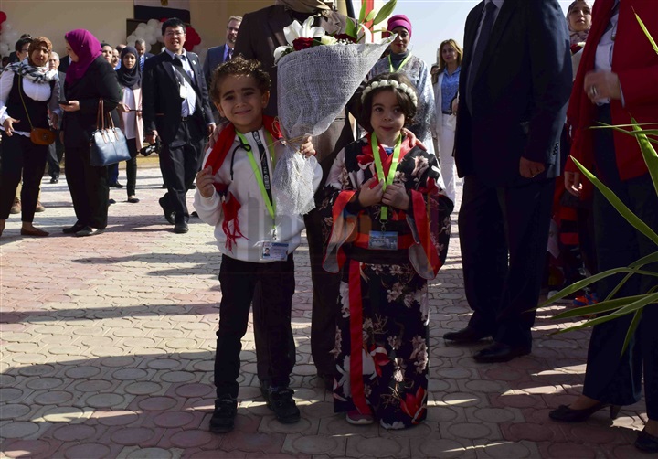 طلاب المدرسة المصرية اليابانية بالعبور يستقبلون الوزراء بالأعلام