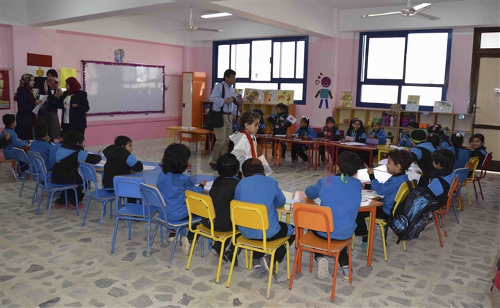قامت الدكتوره سحر نصر وزيرة الاستثمار بمداعبة الأطفال وسحبهم في يديها خلال جولتها داخل المدرسة.