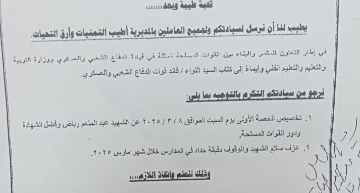 يأتي ذلك في إطار التعاون المثمر والبناء بين القوات المسلحة ممثلة في فيادة الدفاع الشعبي والعسكري ووزارة التربية والتعليم ةالتعليم الفني، وإيماءا إلى كتاب للواء قائد قوات الدفاع الشعبي والعسكري، يتم التوجيه بتنفيذ الآتي: