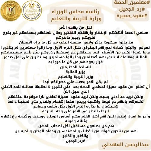 وجه معلمو الحصة رسالة لرئاسة مجلس الوزراء وزارة التربية والتعليم، أكدوا خلالها أنهم بذلوا مجهودا يذكر ولاقوا مشقة أصعب من كل ما يراه الانسان، واثبتوا كفاءة لدورهم البطولي خلال الترم الأول وما زالوا مستمرين لم يتأخروا يوما.