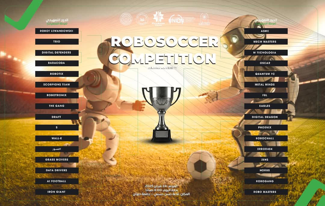 تنظم كلية الهندسة بجامعة حلوان مسابقة Robo Soccer، الحدث التقني الفريد الذي يجمع بين الهندسة والذكاء الاصطناعي والابتكار، وذلك في خطوة تعزز من ريادة مصر في مجال التكنولوجيا والابتكار، وتُقام المسابقة يوم الاثنين الموافق 24 فبراير 2025 في تمام الساعة العاشرة صباحًا بقاعة الدكتور حسن حسني، حيث تشهد تنافسًا بين فرق من الطلاب المبدعين في مجال الروبوتات.