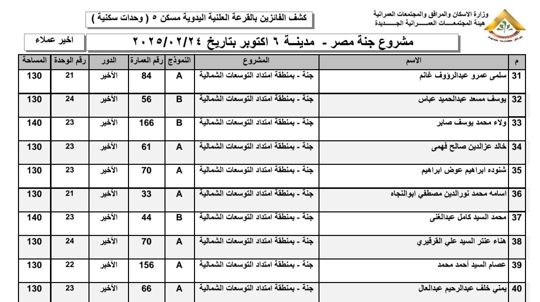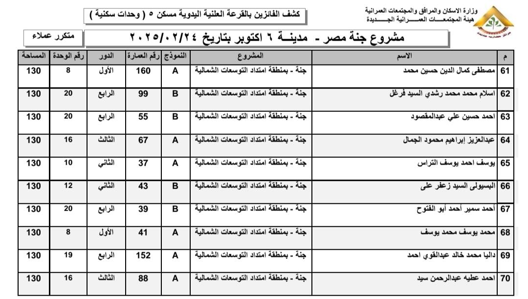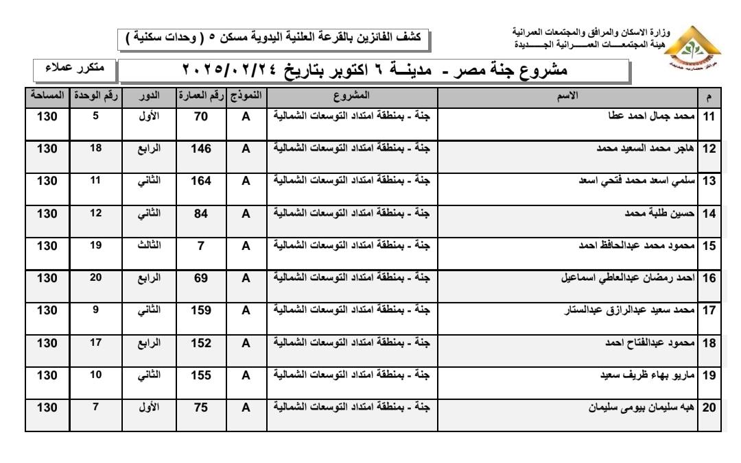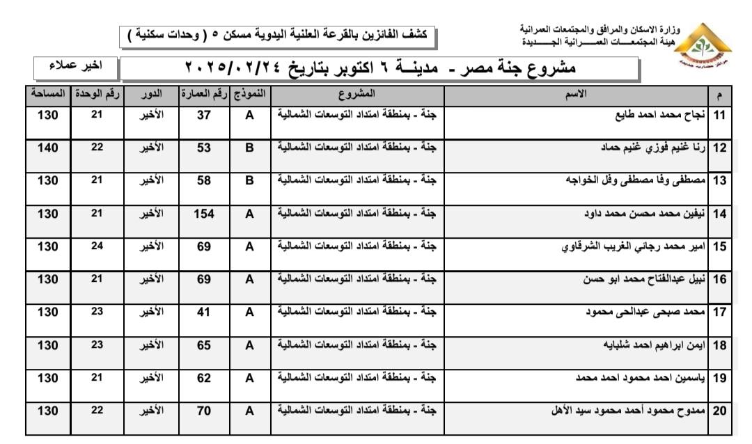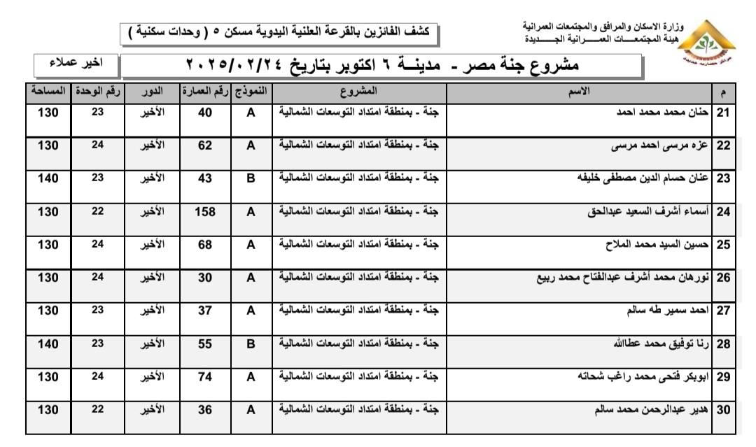 بالصور أسماء الفائزين بقرعة مشروع جنة.. لينك نتيجة (6أكتوبر- القاهرة الجديدة)