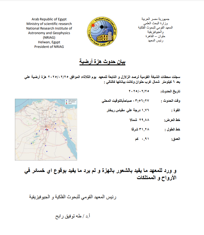 سجلت محطات الشبكة القومية لرصد الزلازل والتابعة للمعهد القومي للبحوث الفلكية والجيوفيزيقية، صباح اليوم الثلاثاء 2025/2/25، هزة أرضية على بعد 6 كيلو مترات شمال غرب حلوان جاءت بياناتها كالتالي: