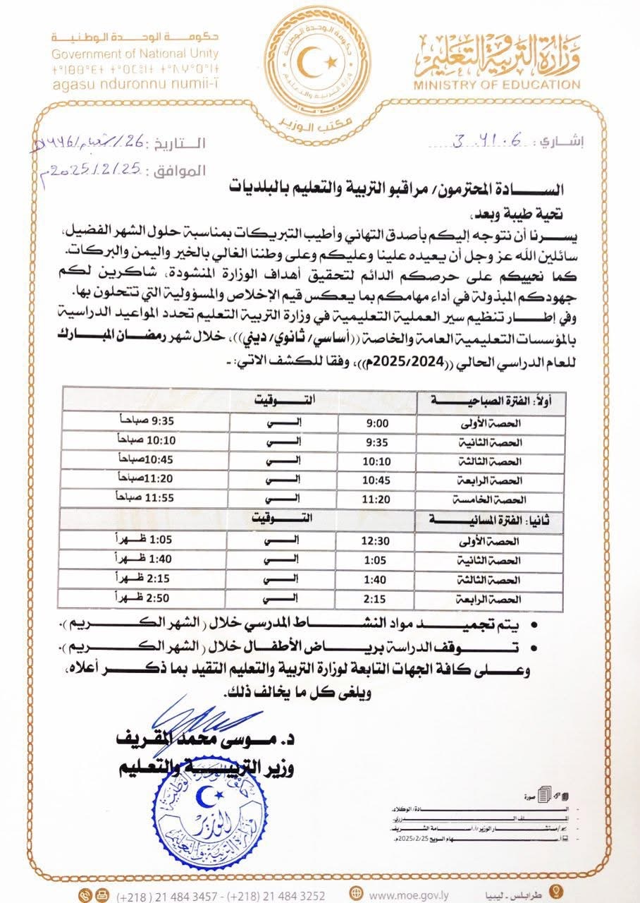أصدر وزير التّربية والتّعليم الدّكتور "موسى المقريف"، تعليماته إلى مراقبي التّربية والتّعليم في البلديات بشأن تحدِيد المواعِيد الدّراسية بالمؤسّسات التّعليمية العامّة والخاصة "أساسي، ثانوي، ديني" خلال شهر رمضان المبارك.