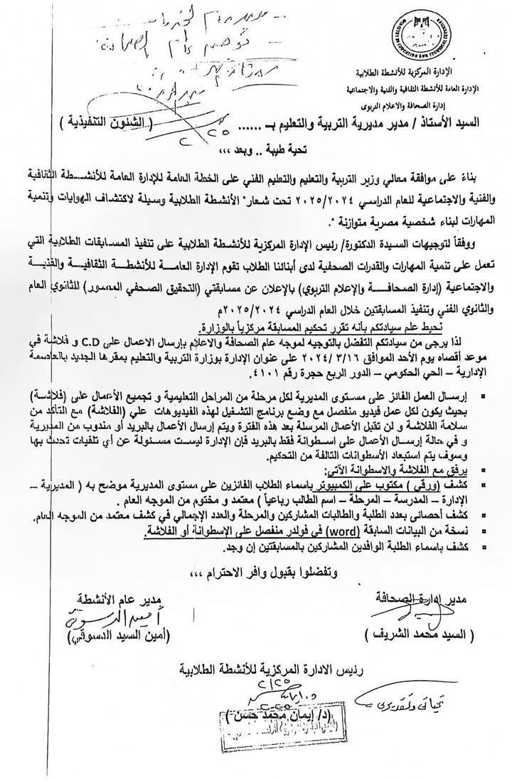 وتقوم الإدارة العامة للأنشطة الثقافية والفنية والاجتماعية إدارة الصحافة والإعلام التربوي بالإعلان عن مسابقتي التحقيق الصحفي المحور الثانوي العام والثانوي الفني وتنفيذ المسابقتين خلال العام الدراسي ٢٠٢٥/٢٠٢٤، وتقرر تحكيم المسابقة مركزيًا بالوزارة.