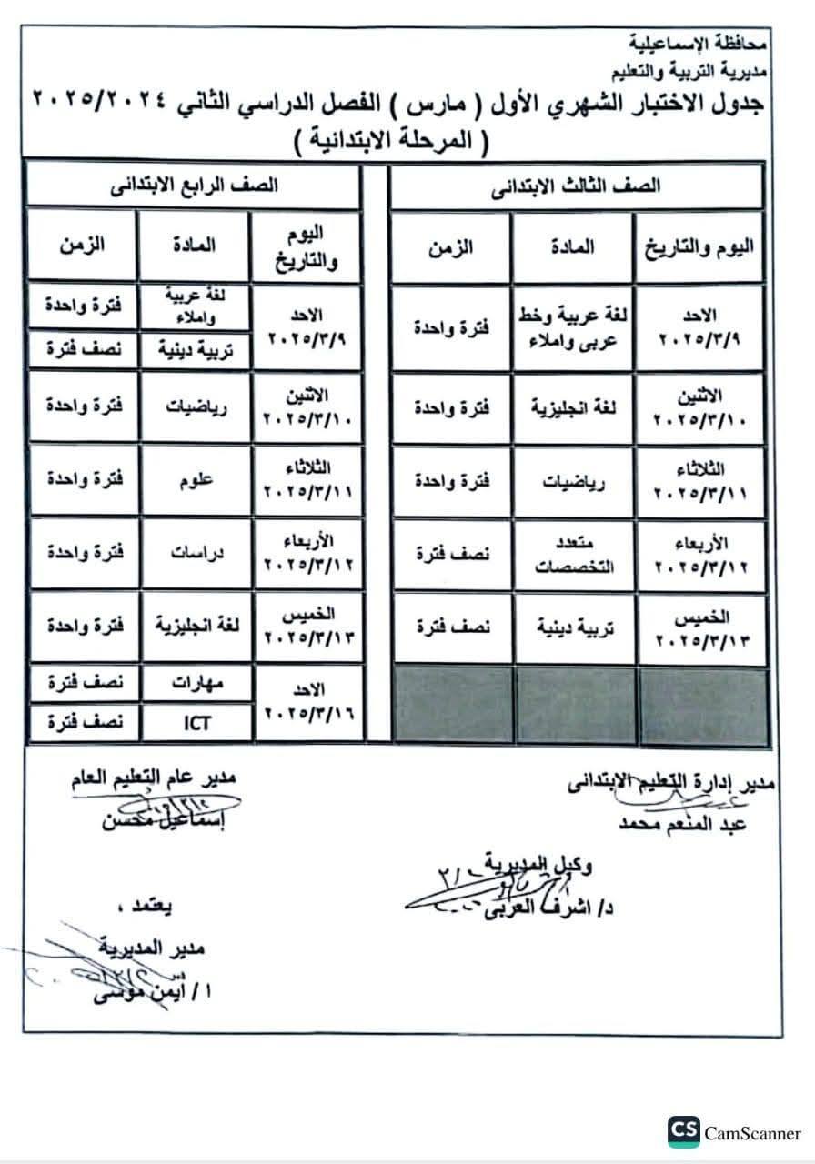 - جدول امتحانات شهر مارس 2025 الصف الرابع الابتدائي الإسماعيلية