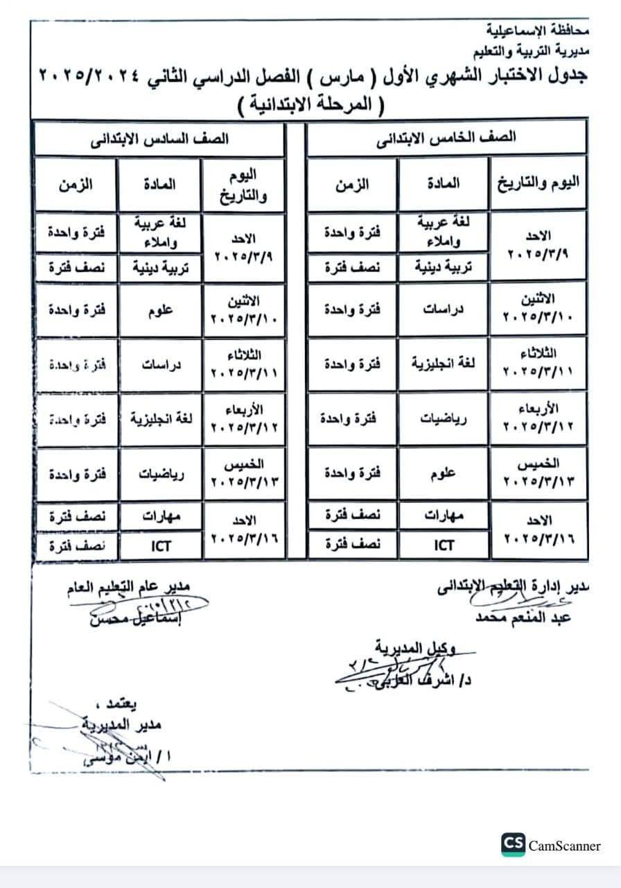 اعرف| جدول امتحانات شهر مارس 2025 المرحلة الابتدائية بالإسماعيلية