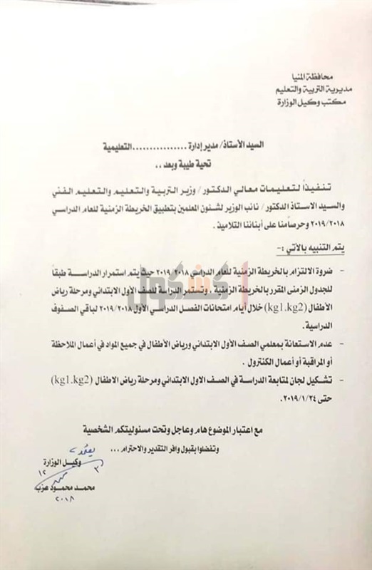 أرسلت وزارة التربية والتعليم والتعليم الفني، خطاباً لجميع المديريات التعليمية بناءا علي تنفيذ تعليمات الدكتور طارق شوقي وزير التربية والتعليم ونائبة لشئون المعلمين الدكتور محمد عمري بتطبيق الخريطة الزمنية لعام الدراسي 2018/2019م.