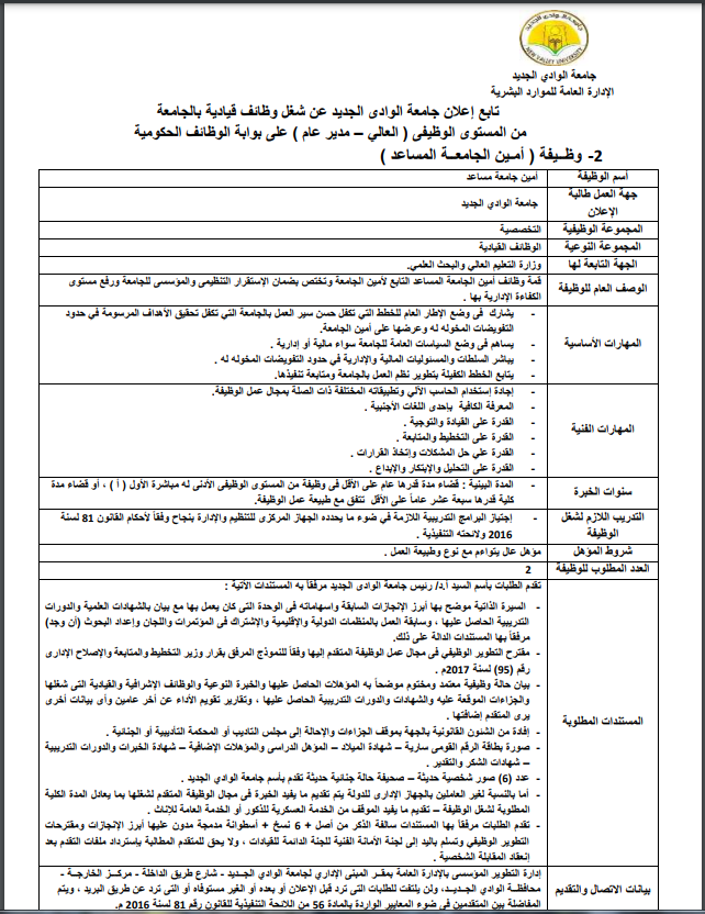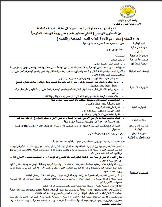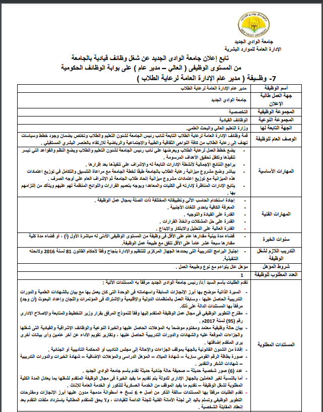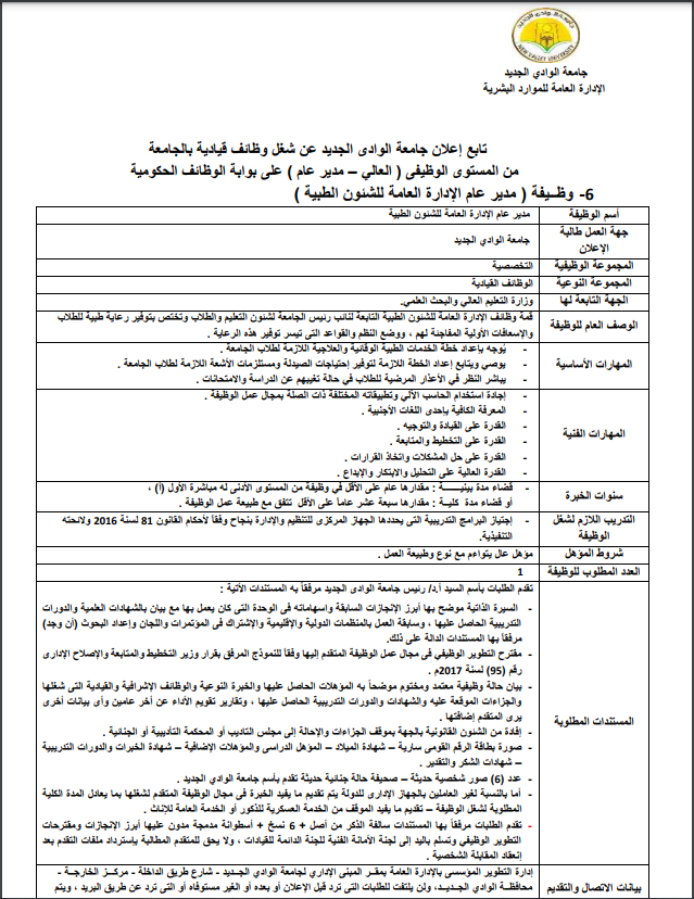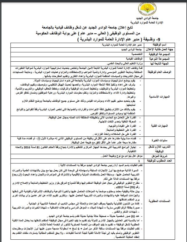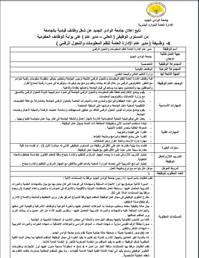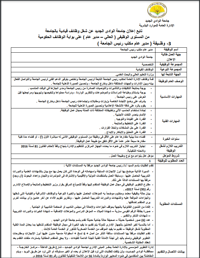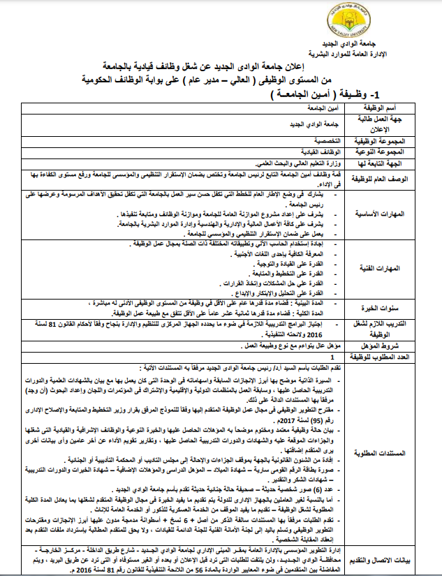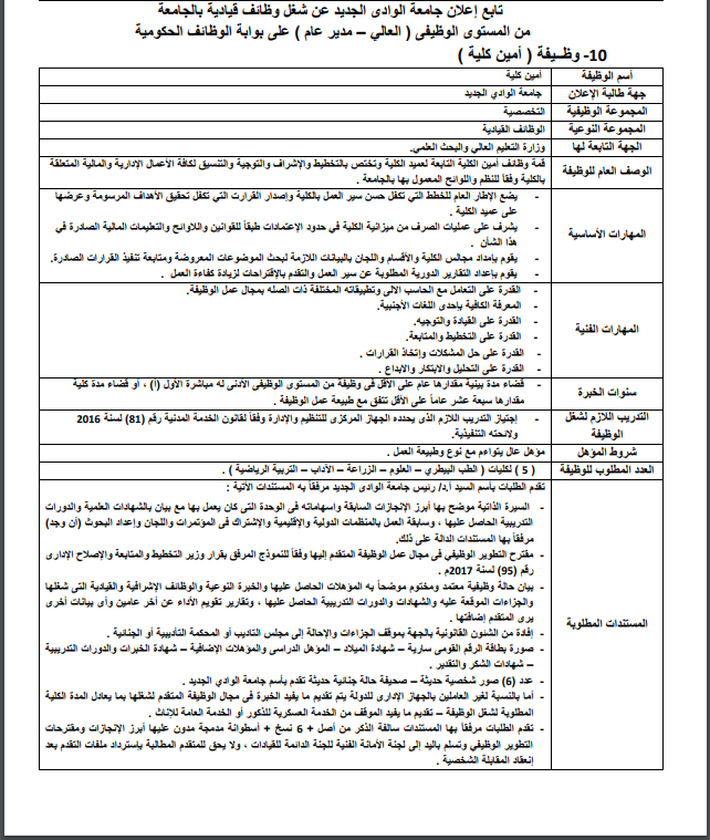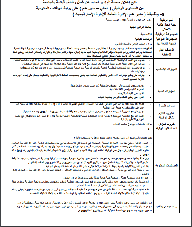 أعلنت جامعة الوادي الجديد عن 10 وظائف قيادية شاغرة لشغل منصب "أمين الجامعة - أمين الجامعة المساعد - مدير عام مكتب رئيس الجامعة - مدير عام الإدارة العامة لنظم المعلومات والتحول الرقمي - مدير عام الإدارة العامة للإدارة الاستيراتيجية - مدير عام الإدارة العامة للشئون الطبية - مدير عام الإدارة العامة لرعاية الطلاب - مدير عام الإدارة العامة للمدن الجامعية والتغذية - مدير عام الإدارة العامة للموارد البشرية - أمين كلية".