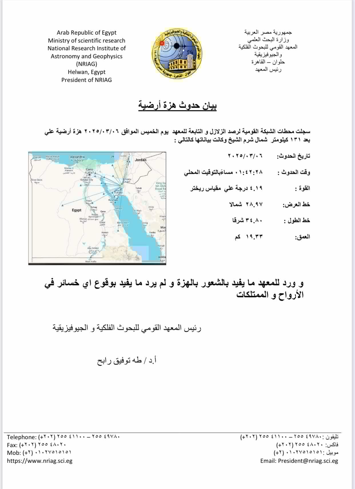 أصدر المعهد القومي للبحوث الفلكية والجيوفيزيقية، بيان عن زلزال حدث منذ قليل بخليج العقبة، مؤكدا أن محطات الشبكة القومية لرصد الزلازل والتابعة للمعهد سجلت، اليوم الخميس، هزة أرضية على بعد 131 كيلومتر شمال شرم الشيخ.