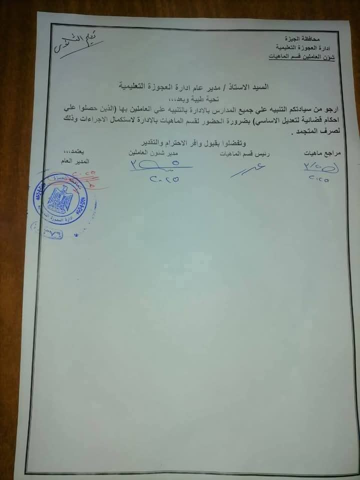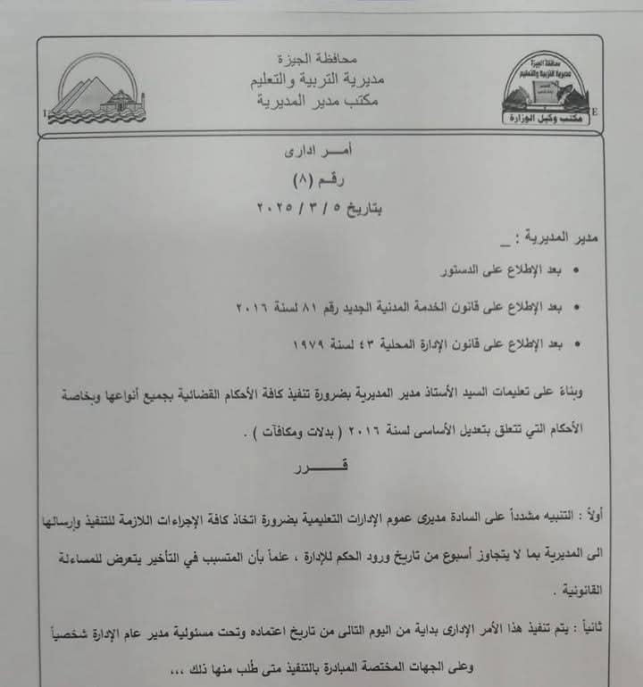 أصدرت مديرية التربية والتعليم والتعليم الفني بمحافظة الجيزة، أمرا إداريا بتاريخ ٥ / ٣ / ٢٠٢٥، شددت خلاله على ضرورة تنفيذ كافة الأحكام القضائية بجميع أنواعها وبخاصة الأحكام التي تتعلق بتعديل الأساسى لسنة ٢٠١٦ ( بدلات ومكافآت ).