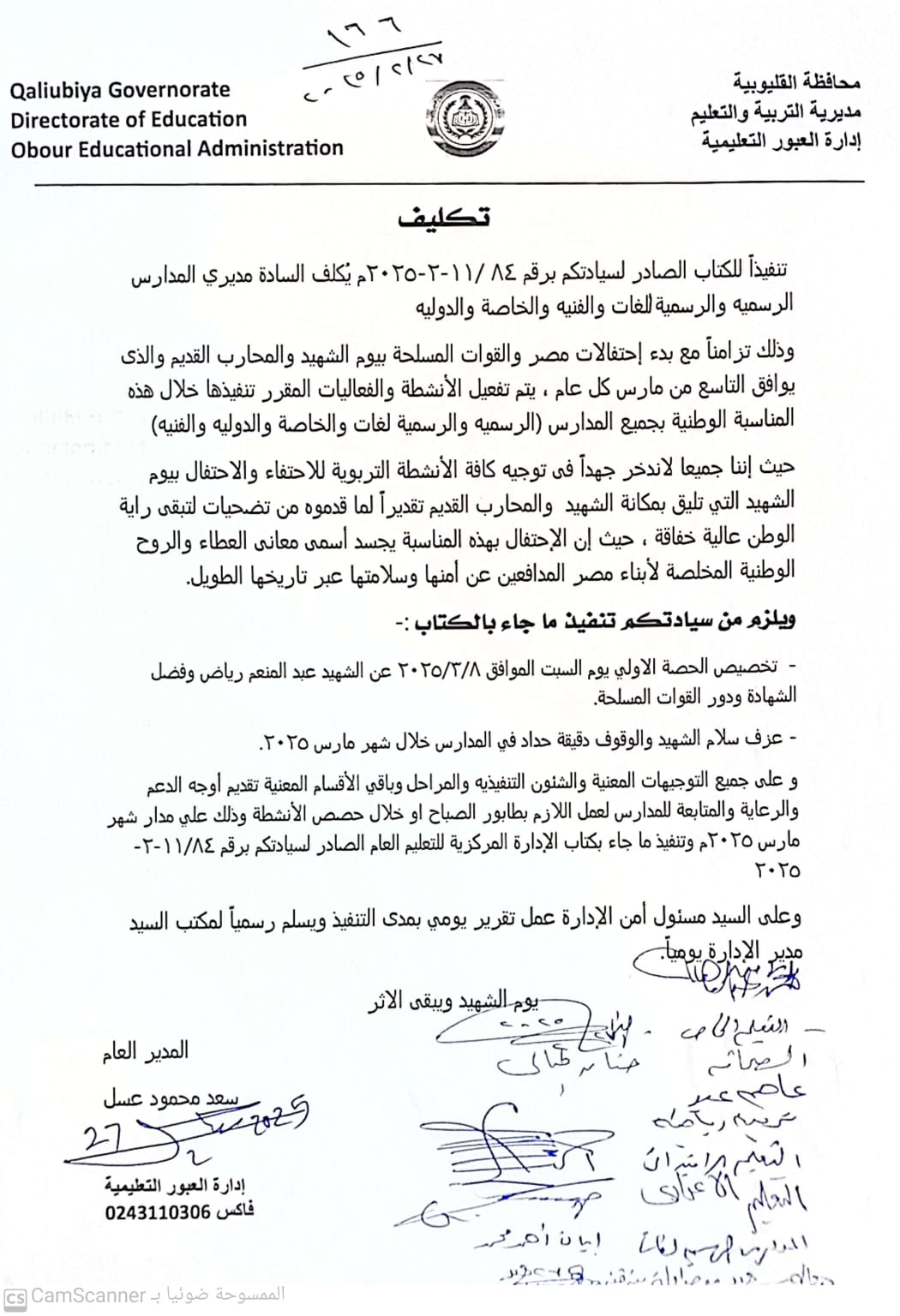 - على جميع التوجيهات المعنية والشئون التنفيذية والمراحل وباقي الأقسام المعنية تقديم أوجه الدعم والرعاية والمتابعة للمدارس لعمل اللازم بطابور الصباح او خلال حصص الأنشطة وذلك على مدار شهر مارس ۲۰۲۵م وتنفيذ ما جاء بكتاب الإدارة المركزية للتعليم العام الصادر برقم ۱۱/۸٤-۲-٢٠٢٥