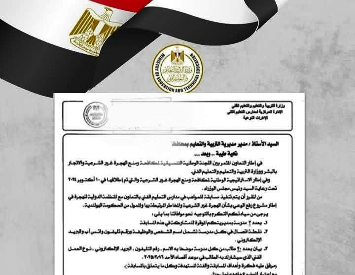 أعلنت وزارة التربية والتعليم والتعليم الفني أنه في إطار تعاونها المثمر بين اللجنة الوطنية التنسيقية لمكافحة ومنع الهجرة غير الشرعية والاتجار بالبشر، عن تنفيذ مسابقة للمواهب في مدارس التعليم الفني بالتعاون مع المنظمة الدولية للهجرة في إطار مشروع رفع الوعي بشأن الهجرة غير الشرعية والمخاطر المرتبطة بها والممول من الحكومة الهولندية.