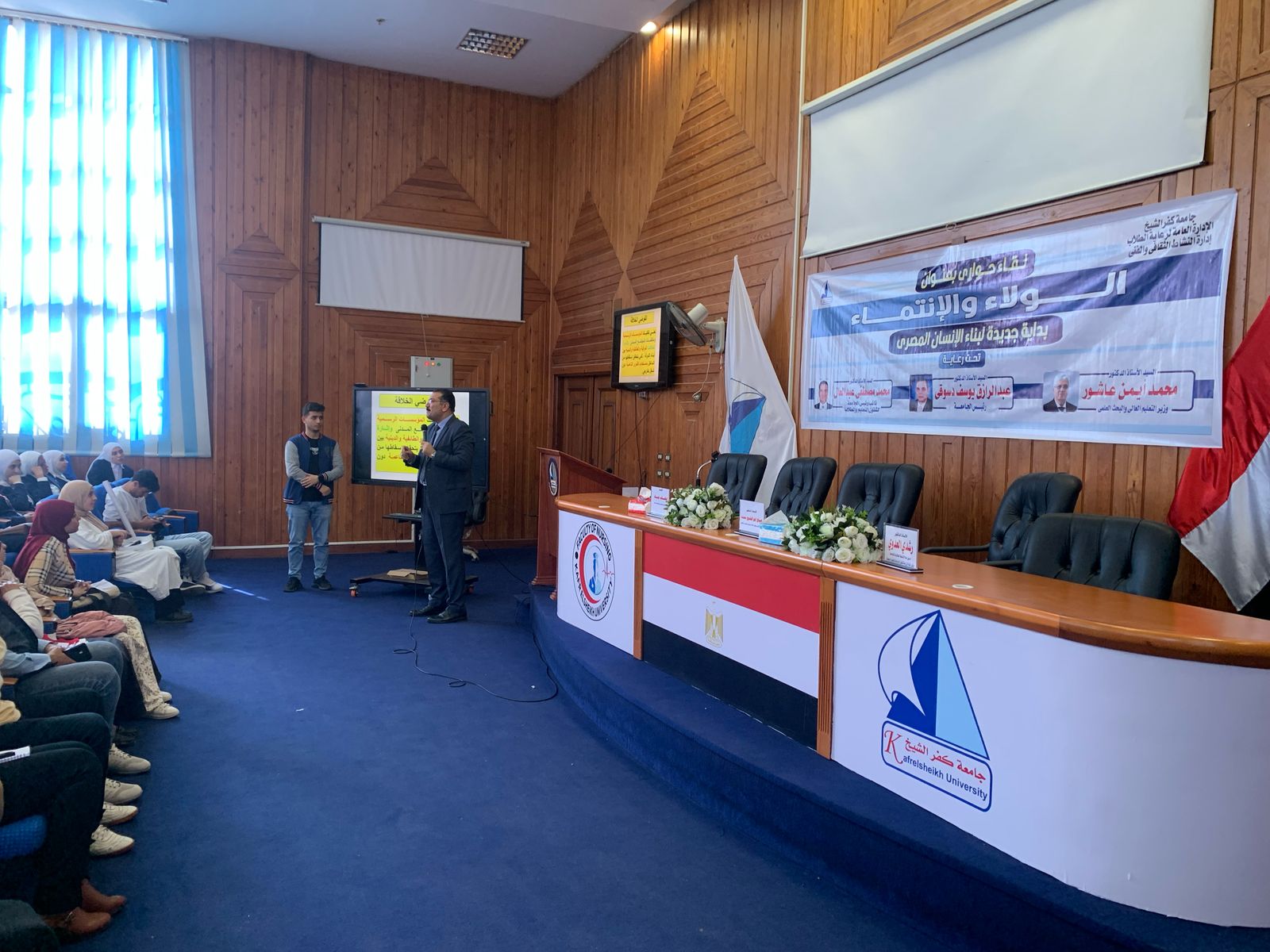 نظمت إدارة النشاط الثقافى والفني بالإدارة العامة لرعاية الطلاب جامعة كفرالشيخ، لقاء حواري بكلية التمريض تحت عنوان "الولاء والانتماء"، تحت رعاية الدكتور عبدالرازق دسوقي رئيس جامعة كفرالشيخ، والدكتور محمد عبد العال نائب رئيس الجامعة لشئون التعليم والطلاب، والدكتور رشدي العدوي منسق عام الأنشطة الطلابية بالجامعة، وبحضور الدكتورة صباح أبو الفتوح عميد كلية التمريض، وتنفيذ ومتابعة إيهاب جاد مدير عام الإدارة العامة لرعاية الطلاب بالجامعة.
