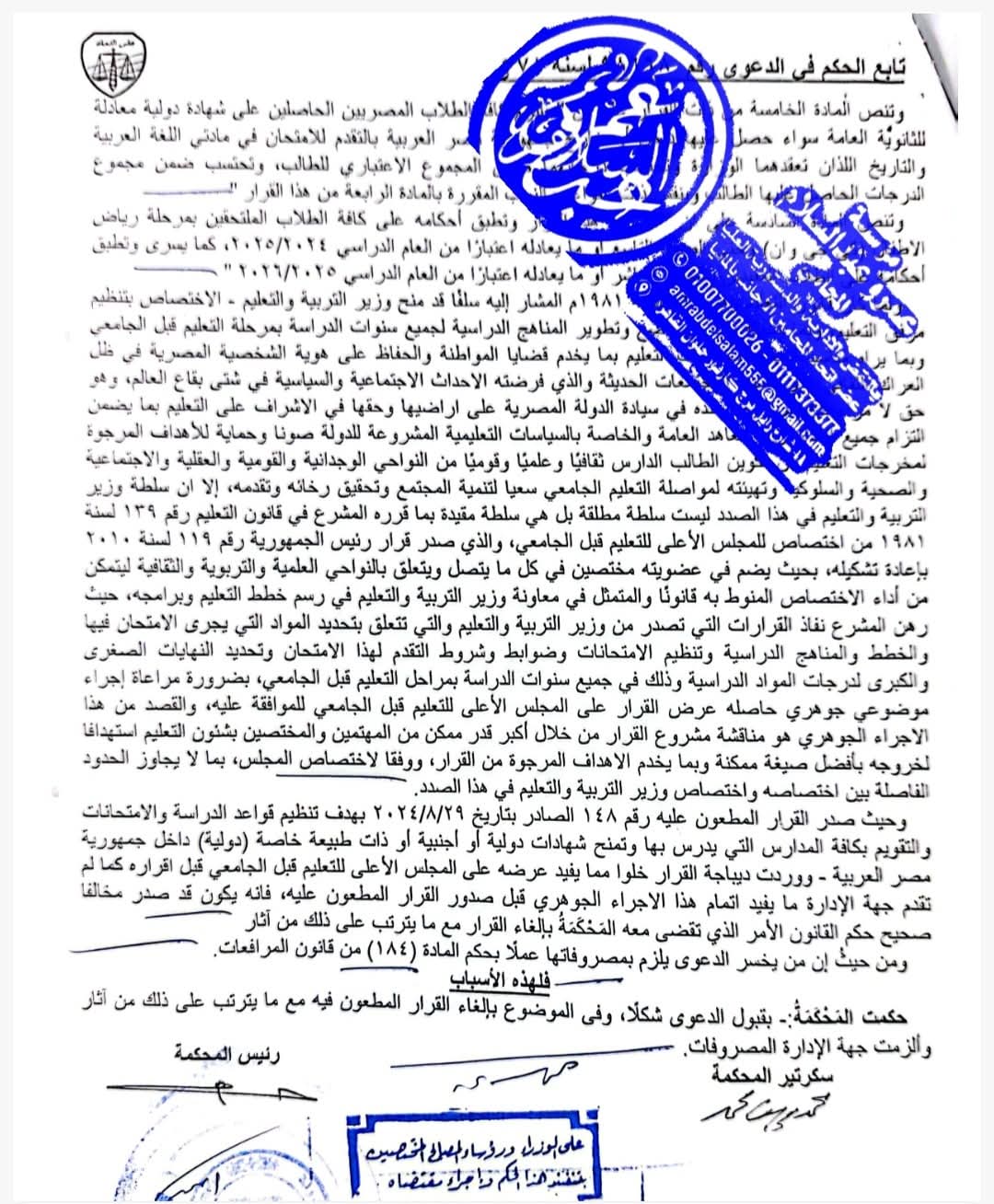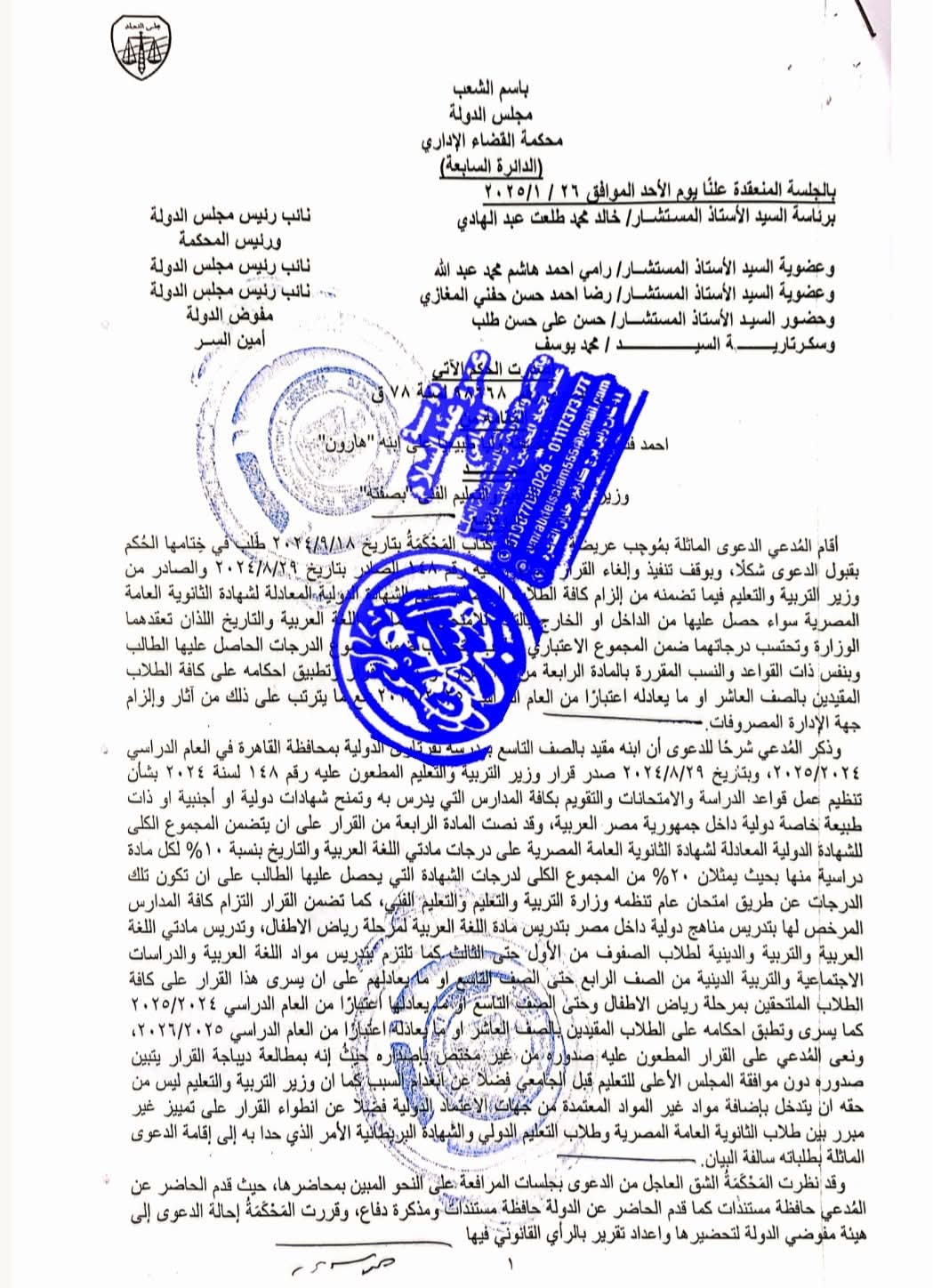 حيثيات الحكم بإلغاء قرار وزير التربية والتعليم بإضافة اللغة العربية والتاريخ لمجموع الشهادات الدولية