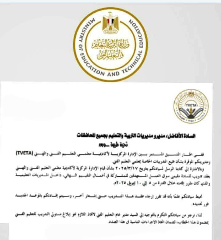 وبالاشارة إلى كتابنا بتاريخ ۲۰۲۵/۳/۱۷ بشأن قيام الإدارة المركزية لأكاديمية معلمي التعليم الفني والمهني بعقد تدريب لمقيمي سوق العمل المستهدفين للمشاركة في أعمال التقييم النهائي داخل المديريات التعليمية والذي كان مقرر إقامته خلال الفترة من 5 إلى 10 إبريل ٢٠٢٥م.