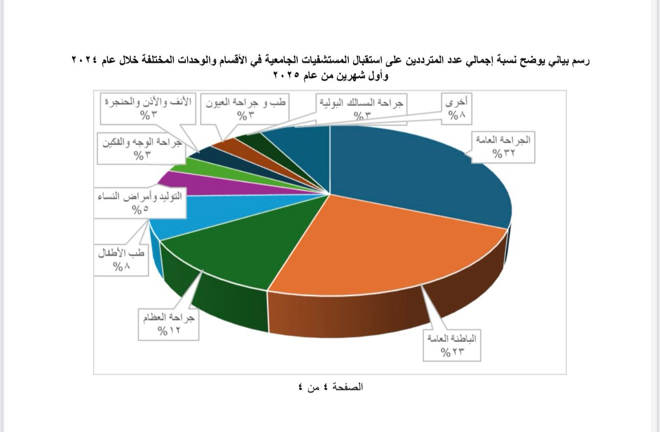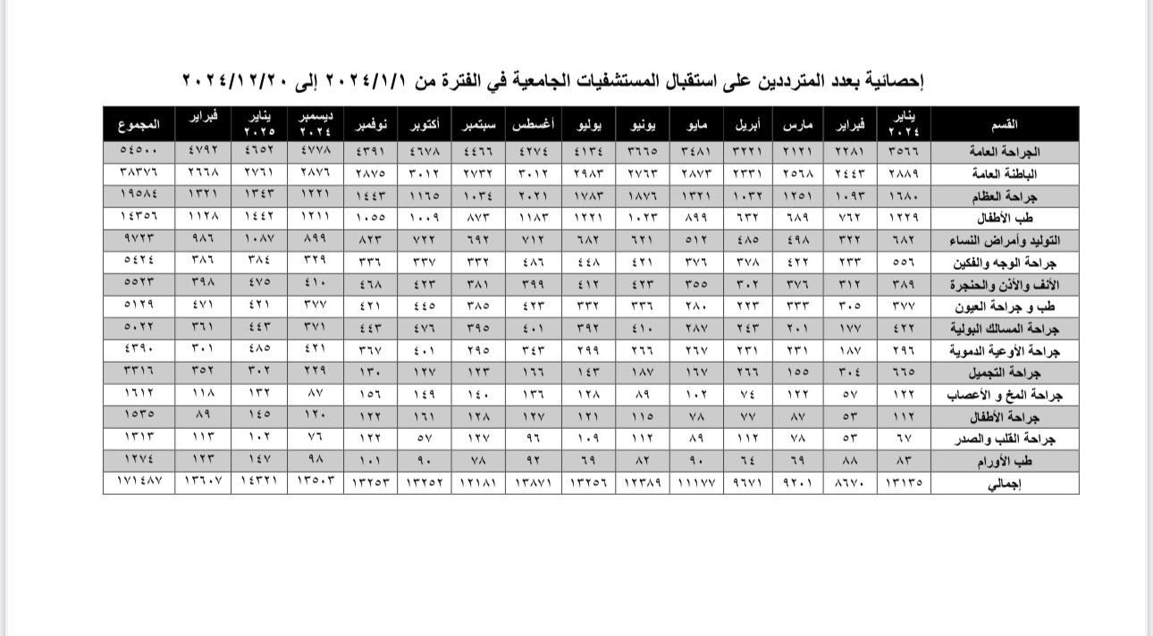أعلنت إدارة التسجيل الطبي والإحصاء بمستشفيات سوهاج الجامعية أن إجمالي عدد المترددين على أقسام الاستقبال المختلفة بالمستشفيات الجامعية خلال الفترة من ١ يناير ٢٠٢٤ وحتى مارس ٢٠٢٥ بلغ نحو ١٧١ ألف و٤٨٧ مريضًا، والذي يبرهن على أنها تحظى بثقة المواطنين، حيث يتم استقبال الحالات على مدار ٢٤ ساعة داخل الأقسام المختلفة.