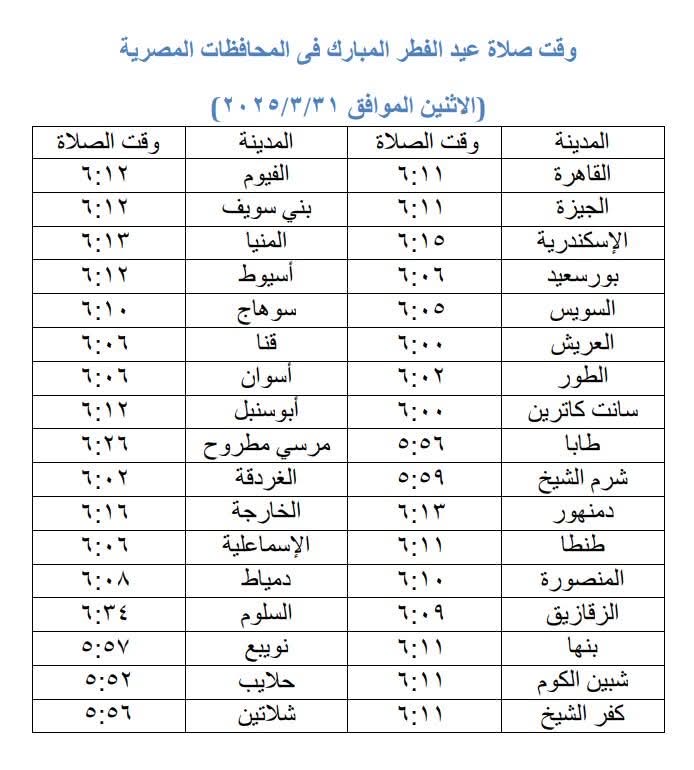عاجل.. موعد صلاة عيد الفطر المبارك في المحافظات المصرية
