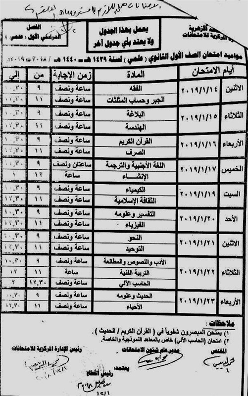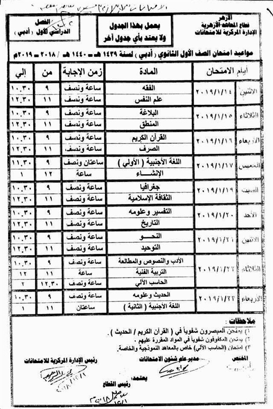 أعلنت رئاسة قطاع المعاهد الأزهرية، جداول امتحانات الفصل الدراسي الأول، للنقل فى الثانوية الأزهرية، للعام الدراسي 2018/2019، وتنهى بذلك الجدل القائم حول امتحانات الصف الأول الثاتنوى والذى ظهر فى الجدول على أنه فترة واحدة.