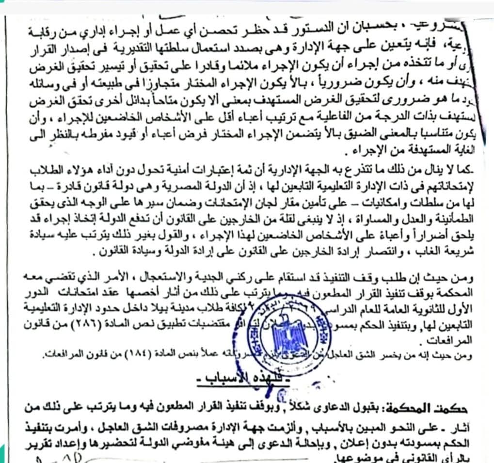 ولفت إلى أنه سبق للقضاء الإداري التصدي لوزير التربية والتعليم عام 2020 بإلغاء قراره بنقل مقار اللجان الامتحانية من قري ومراكز مدينة بيلا بكفر الشيخ إلى مقر المحافظة تخفيفا على الطلاب مشقة التنقل لأماكن بعيدة عن محال إقامتهم.