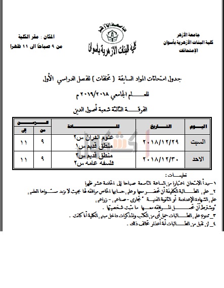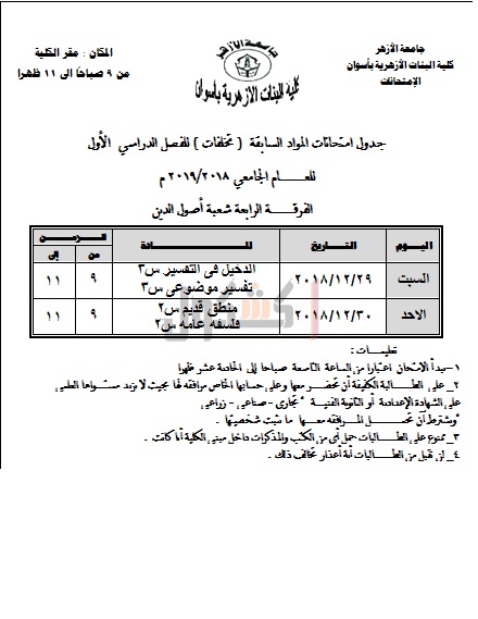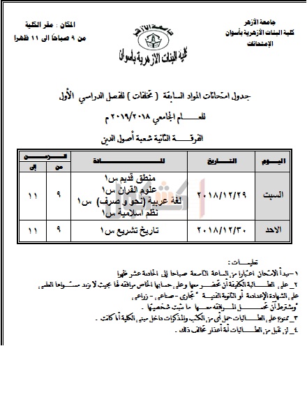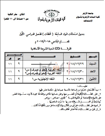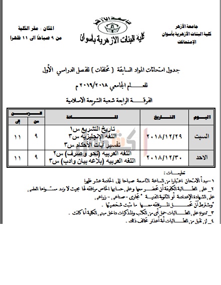 الإسلامية والعربية للطالبات بجامعة الأزهر فرع أسوان للبنات، عن جداول إمتحانات