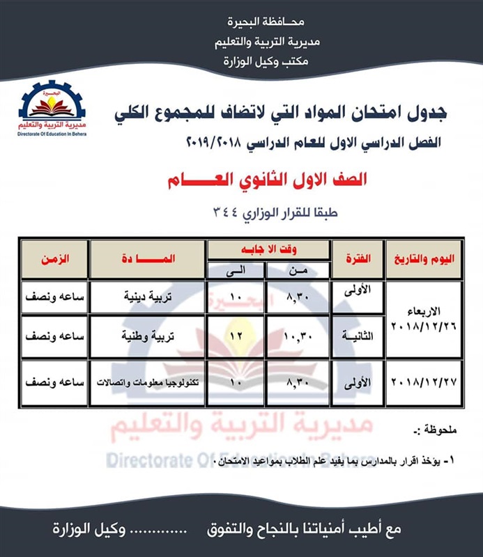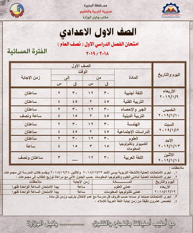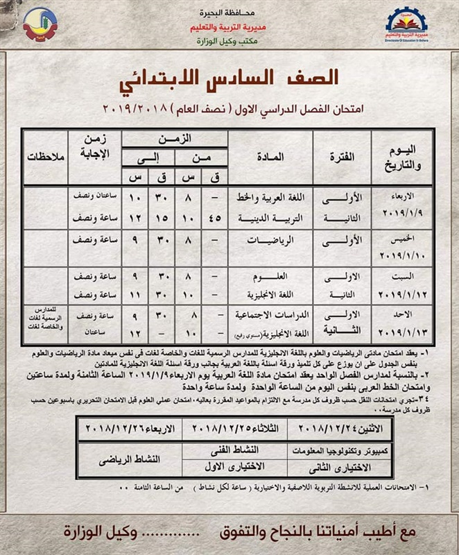 ننشر جداول امتحانات الفصل الدراسي الأول لجميع المراحل التعليمية بمدارس محافظة البحيرة