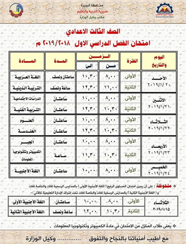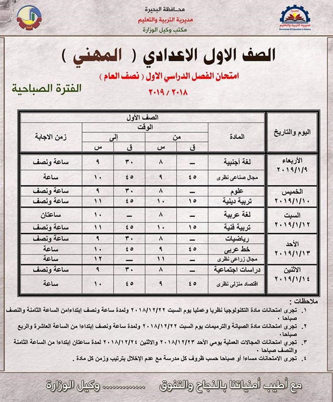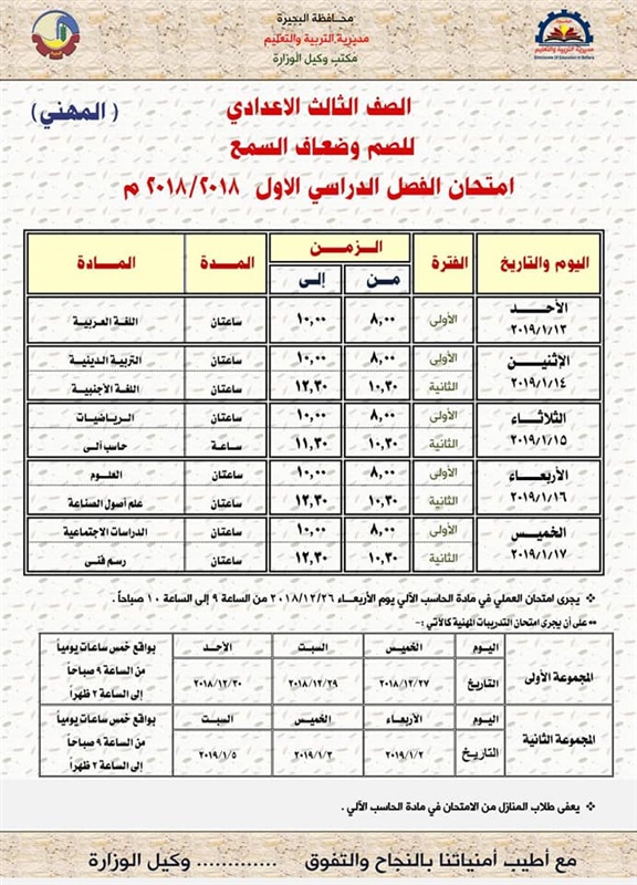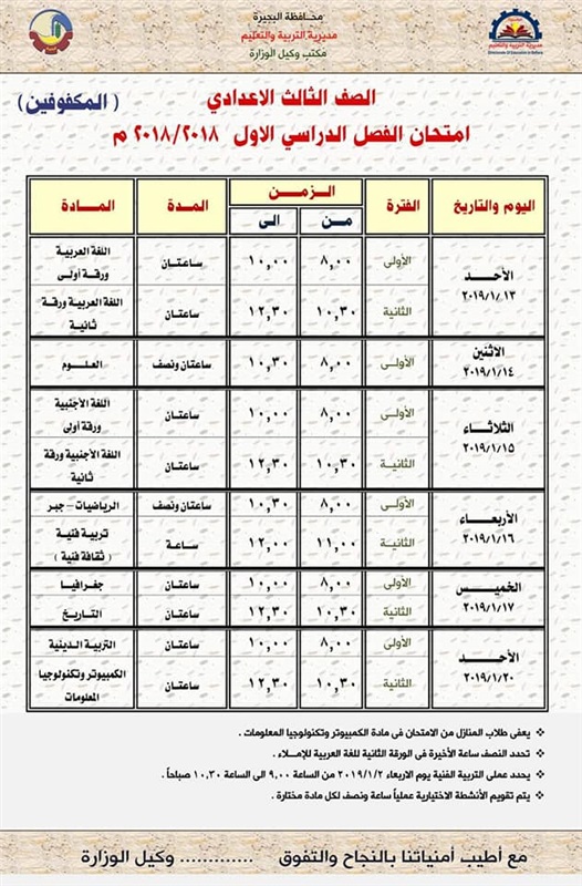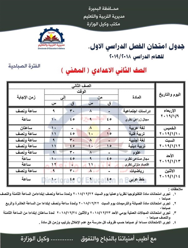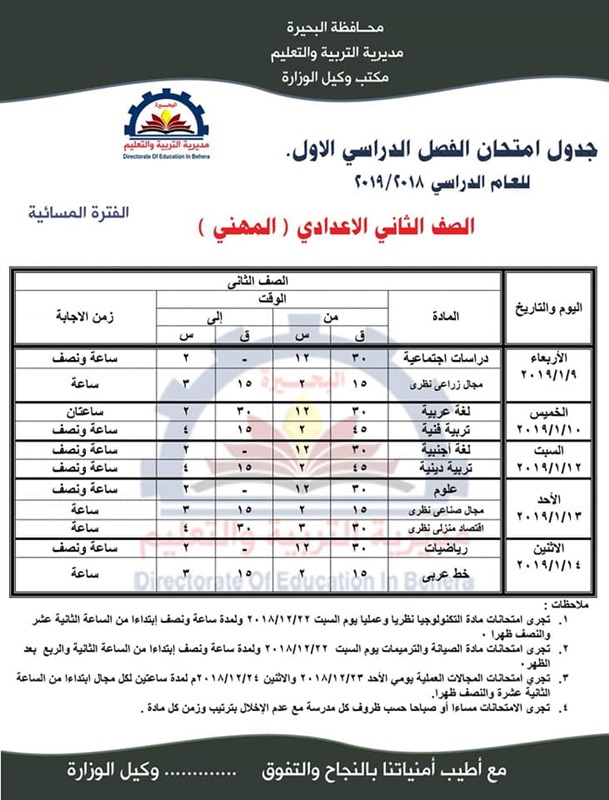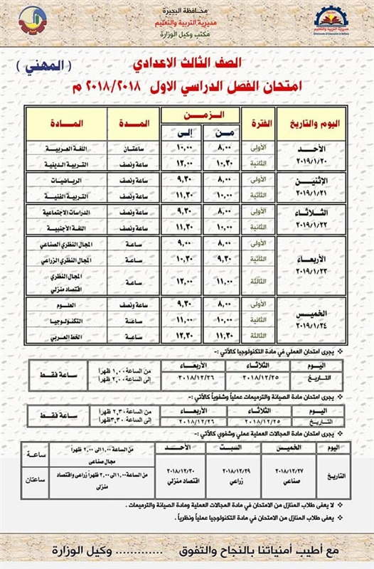 العام والمهني من يوم 9 وحتى 14 يناير 2019، بينما تبدأ امتحانات الصف الثالث الإعدادي