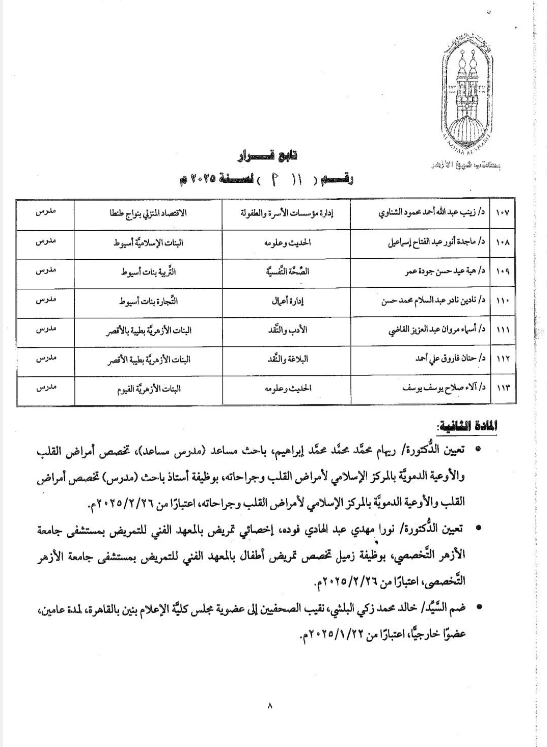 أصدر فضيلة الإمام الأكبر، الدكتور أحمد الطيب، شيخ الأزهر، القرار رقم (١١أ) لعام 2025م بضم خالد محمد زكي البلشي، نقيب الصحفيين، إلى عضوية مجلس كلية الإعلام بنين، بجامعة الأزهر، لمدة عامين، عضوًا خارجيًا، اعتبارًا من 2025/1/22م.