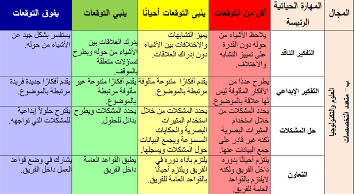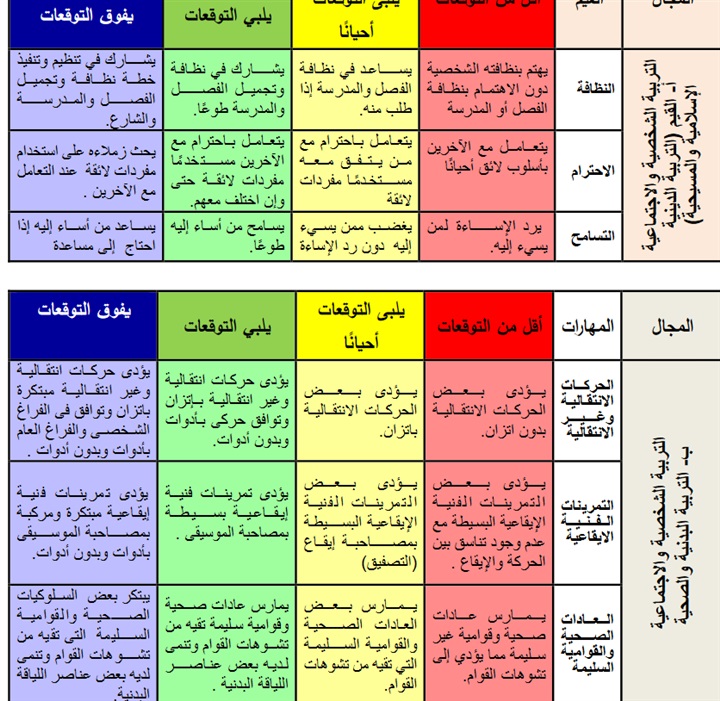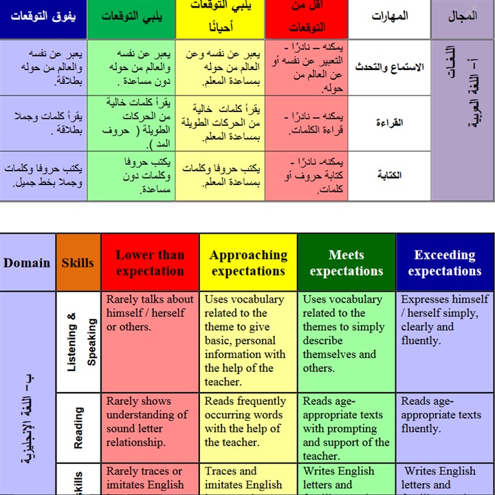 وأشارت الوزارة إلي أنها انتقلت في تقييم مستويات التلاميذ من إصدار أحكام أو إعطاء درجات إلي التقييم من خلال الألوان التى تعطى دلالات محددة للمعلم ولولى الأمر، اللون الأصفر يلبي التوقعات أحيانا، وهذا يعنى أن المتعلم يمتلك نقاط ايجابية، أما اللون الأخضر فيلبي التوقعات، وهذا يعنى أن المتعلم اكتسب جميع المهارات المستهدفة، أما اللون الأزرق، فيعنى أنه وظف ما اكتسبه من مهارات في إظهار نواتج إبداعية تمثل مؤشرات للنبوغ.