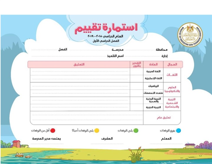 نشرت وزارة التربية والتعليم عبر موقعها الرسمي دليل المعلم لتعبئة استمارة التقييم للصف الأول الابتدائي، حيث أكدت الوزارة أنه تم تغيير أسلوب التقييم للصف الأول الابتدائي لمواكبة النظام الجديد والانتقال من ثقافة الاختبارات التنافسية إلي ثقافة التقييم التكوينى المستمر.