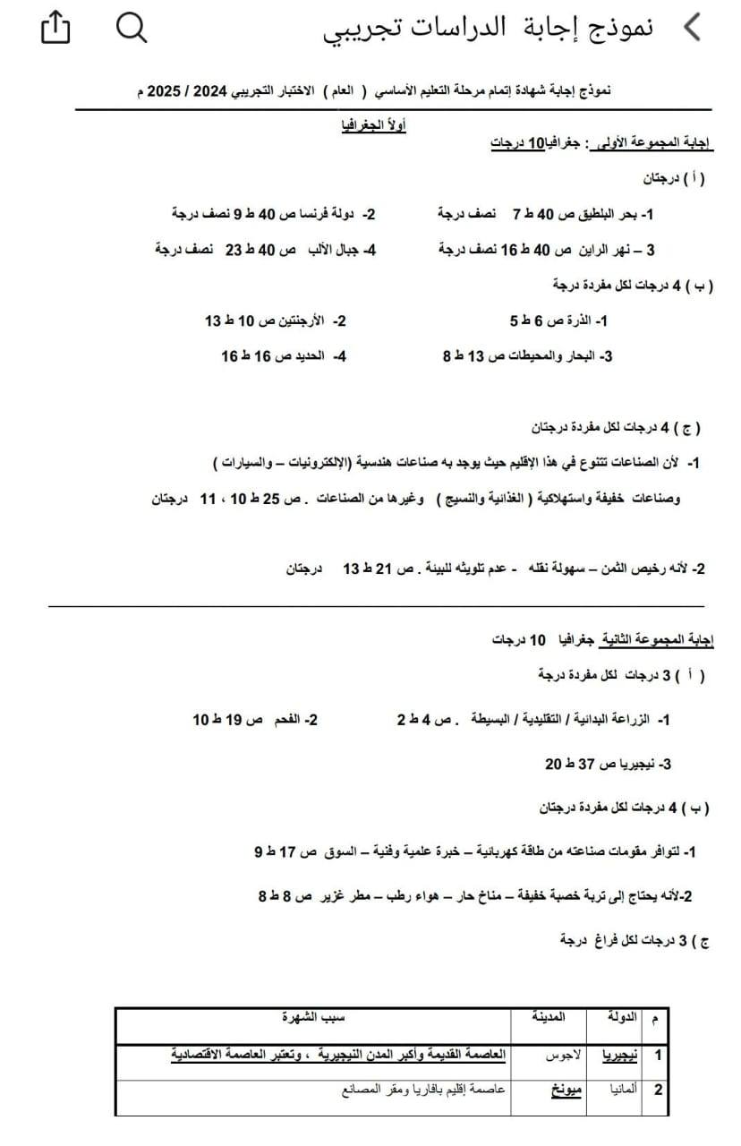 إجابة النموذج الاسترشادي في مادة الدراسات الاجتماعية لطلاب الإعدادية