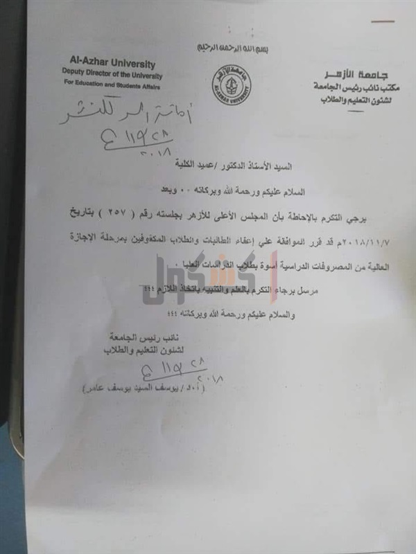 وعممت جامعة الأزهر، منشوراً على الكليات، أعلنت فيه موافقة المجلس الأعلى للأزهر، على إعفاء الطلاب المكفوفين بمرحلة البكالوريوس من المصروفات الدراسية، أسوة بطلاب مرحلة الدراسات العليا.