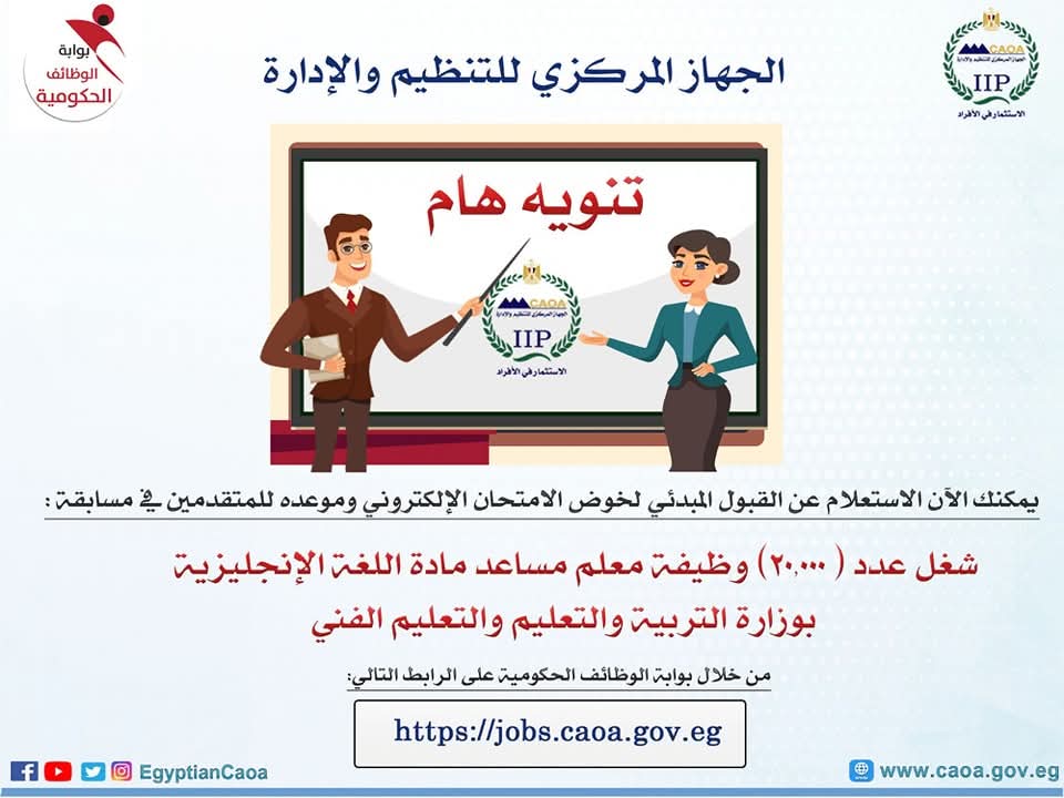 أتاح الجهاز المركزي للتنظيم والإدارة، الاستعلام عن القبول المبدئي لخوض الامتحان الإلكتروني لعدد 20 ألف وظيفة معلم مساعد مادة اللغة الإنجليزية لصالح وزارة التربية والتعليم والتعليم الفني.