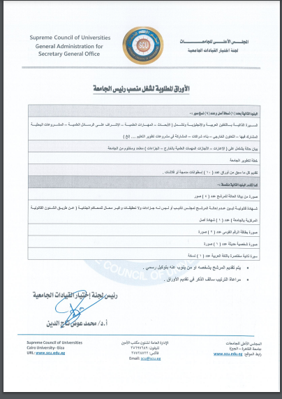 أعلن المجلس الأعلى للجامعات عن فتح باب التقدم للترشح لمنصب رئيس الجامعة في الجامعات الآتية: جامعة مطروح – جامعة بنى سويف – جامعة كفر الشيخ – جامعة الغردقة – جامعة العريش، 3 مايو المقبل، بمقر أمانة المجلس الأعلى للجامعات.