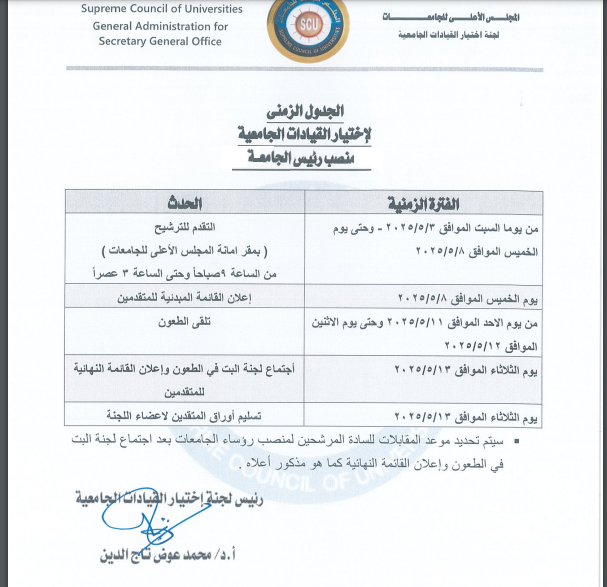 فقد تقرر فتح باب التقدم للترشح لمنصب رئيس الجامعة في الجامعات الآتية: جامعة مطروح - جامعة بنى سويف - جامعة كفر الشيخ - جامعة الغردقة - جامعة العريش، طبقًا للجدول الزمني، التالي: