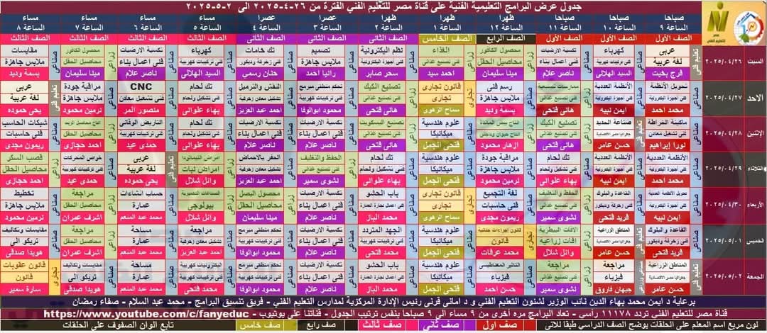 جدول عرض البرامج التعليمية الفنية على قناة التعليم الفني