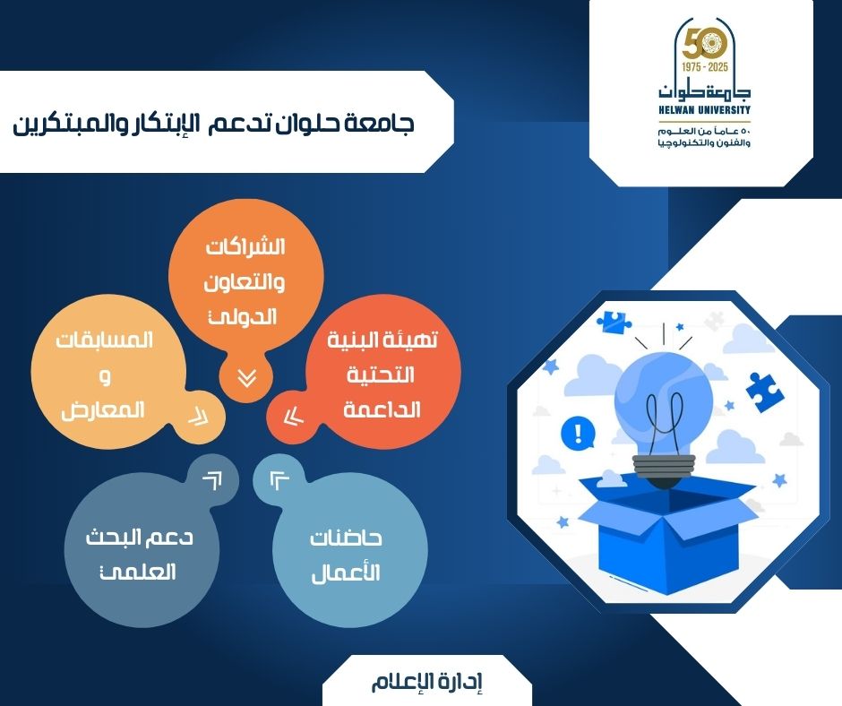 ليس ذلك فقط، وإنما أطلقت جامعة حلوان عدة حاضنات من خلال مكتب الحاضنات التكنولوجية، كان منها حاضنة Edu Talent: تُعنى بدعم الابتكار في مجال التعليم، وتمكين الطلاب والخريجين من تحويل أفكارهم التعليمية إلى مشروعات ناجحة؛ حاضنة Biocluster: وتركز على دعم الشركات الناشئة في مجالات التكنولوجيا الحيوية والبيئية؛ حاضنات أخرى مثل حاضنة الأثاث المصري، وحاضنة الأميرة فايزة للرياضة، وحاضنة الفنون الإبداعية، وجميعها تُسهم في تطوير مشاريع متنوعة تخدم المجتمع.