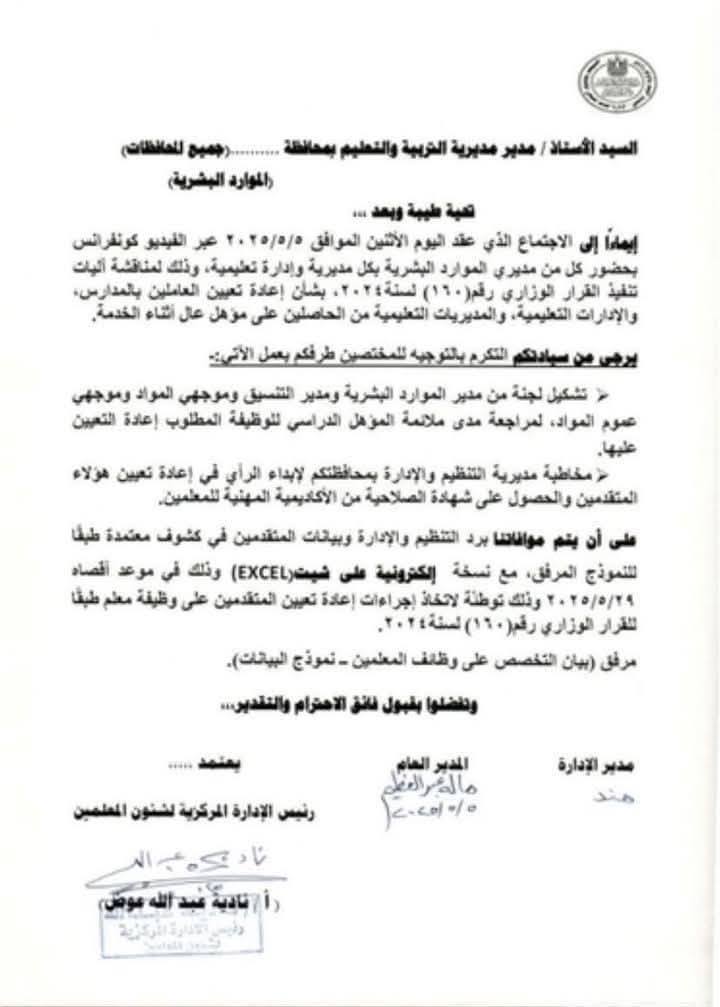 - يتم موافاة وزارة التربية والتعليم، برد التنظيم والإدارة وبيانات المتقدمين في كشوف معتمدة طبقا للنموذج مع نسخة إلكترونية على شيت (EXCEL) وذلك في موعد أقصاه ۲٠٢٥/٥/٢٩ وذلك لاتخاذ إجراءات إعادة تعيين المتقدمين على وظيفة معلم طبقا للقرار الوزاري رقم (١٦٠) لسنة ٢٠٢٤.