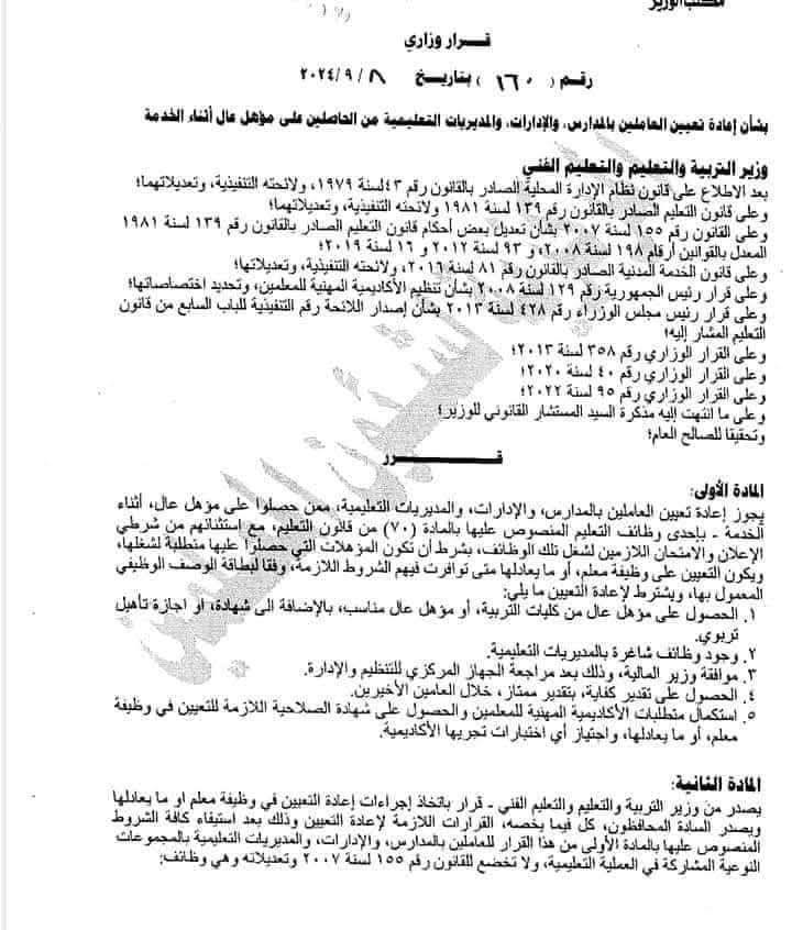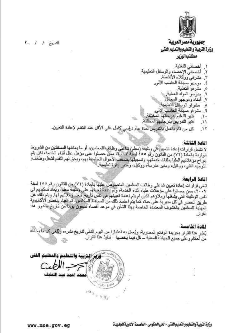 يصدر من وزير التربية والتعليم والتعليم الفني قرار باتخاذ إجراءات إعادة التعيين في وظيفة معلم أو ما يعادلها ويصدر المحافظون كل فيما يخصه.