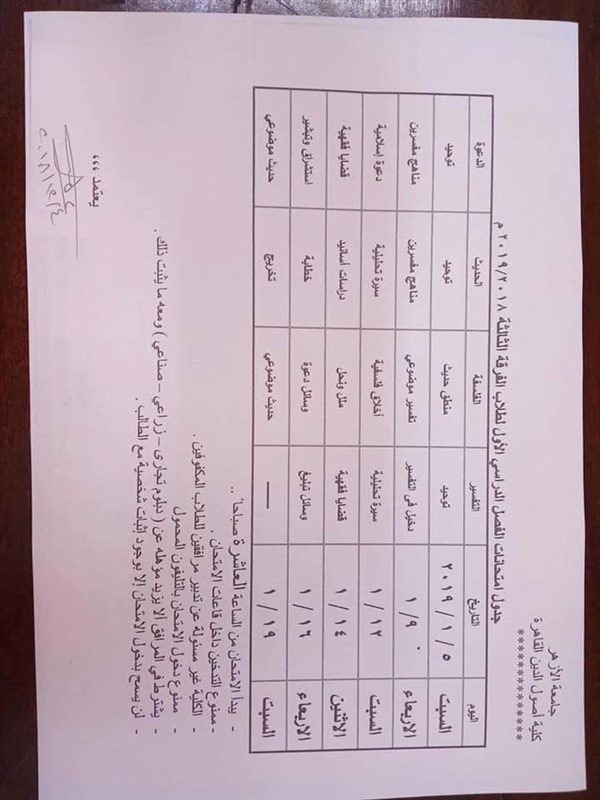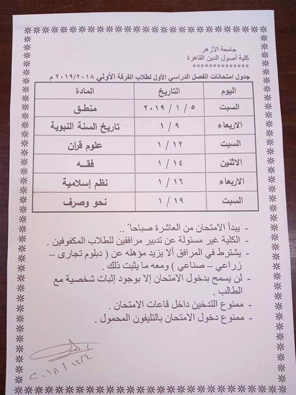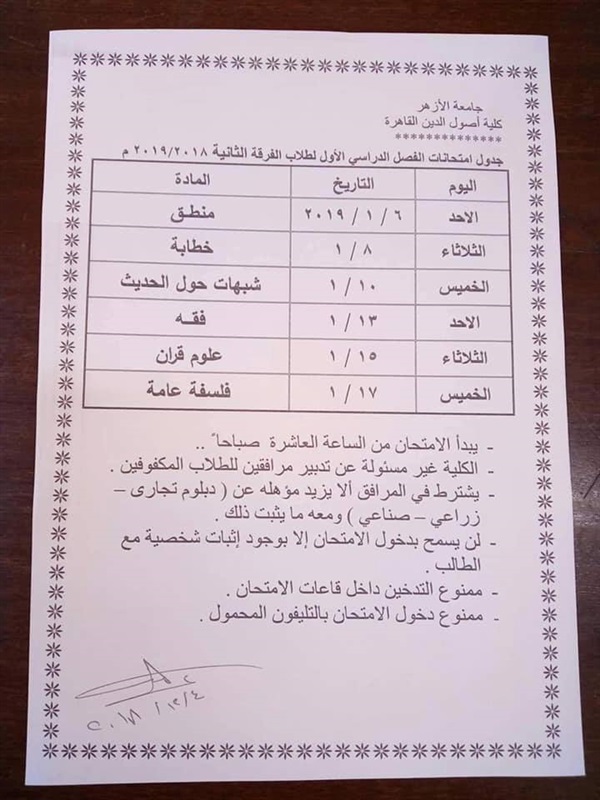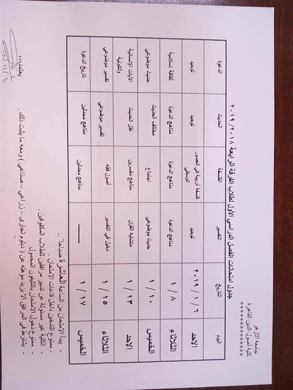 بالصور.. ننشر جداول امتحانات الفصل الدراسى الأول لـ"أصول الدين"